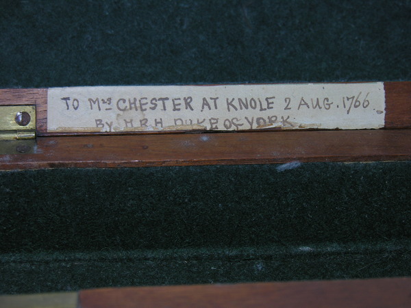 Green rayskin. Rayskin of this size was very expensive, a noble gift. Crown forward. Adams is optician to the king. Dollond is optician to the Duke of York. Scope was gift to Duke's mistress. "HRH Duke of York's present to Mrs Chester at Knole 2nd Aug 1766" Earliest surviving four-lens eyepieces, rendering five-lens eyepiece obsolete. Corrected for spherical and chromatic aberration. Silvered rings, silver on black ivory.