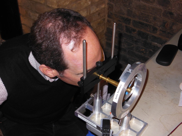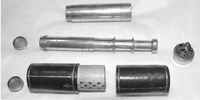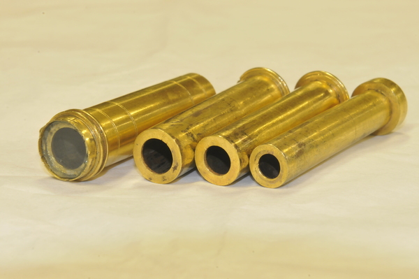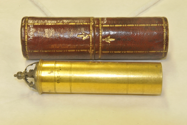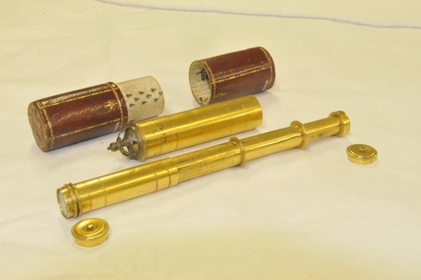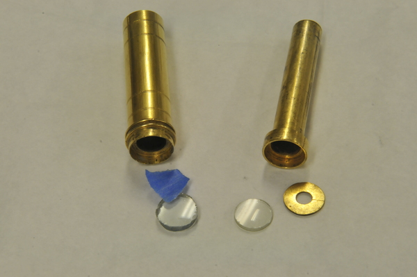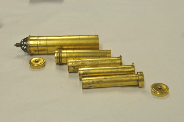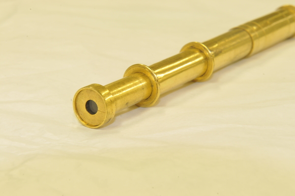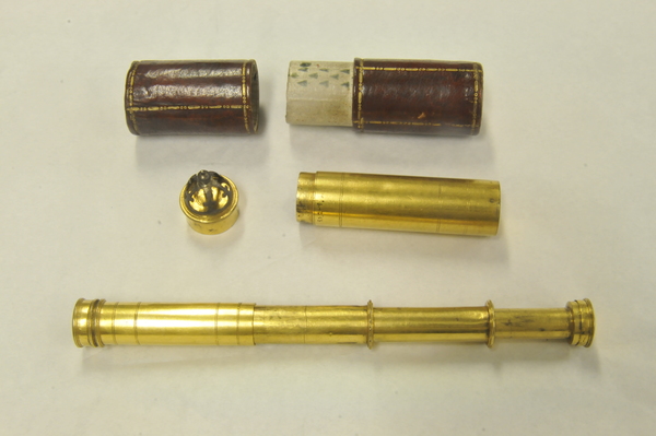 Pasteboard etui 88.5 long, diam 25.0. Brass container with crown 83.7, diam 18.2. With the crown the collapsed telescope fits well into the leather etui; without it, not. Starside end of Draws 1, 2, and 3 has brass washer; the inner diameter of each draw is larger than the opening of its washer. Optical length determined for target at 142 paces (MK). Two extension marks on each draw: (1) 5.5, 28.6; (2) 6.7, 23.5; (3) 5.4, 30.0. This leads to total optical lengths of 180 mm (no image visible at this length) for the leftmost extension marks and 119.5 - 121.7 mm for the rightmost marks. When focused at distant object, the telescope is about 117 mm long. Direct measurement using a collimated beam yielded a focal length of 160 mm vs 169 mm measured by Rolf Willach. The latter measurement implies an eyepiece focal length of 52 mm, and a magnification of 3.25, consistent with our observations.
