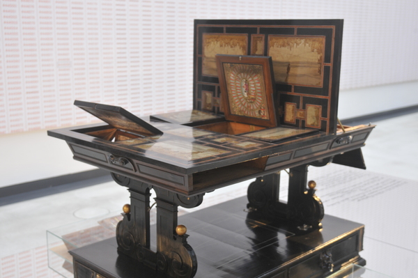The collapsible desk-table (the so-called Arbeitstisch) is thought to have belonged to Electress Magdalena Sibylla (1586-1659), second wife of Elector Johann Georg I of Saxony (reigned 1611-1656). Besides the telescope presented here, it contains a virginal and compartments for a wide range of mathematical instruments and writing implements, an apothecary, board games and a folding armchair, all of which can be collapsed to rest on top of, or nestle within, the long, flat rectangular wooden base of the desk. Another piece of complex furniture in the Kunstgewerbemuseum in Pillnitz is often regarded as the pendant to this Arbeitstisch: the portable hunting and tool chest (so-called Jagd- und Werkzeugtisch, inv.-nr. 47724) belonging to Elector Johann Georg. Interestingly, it is her furniture, not his, that contains mathematical instruments, a musical keyboard and the telescope described here. It should also be recalled that the Electress possessed her own Kunstkammer, which was visited by Philipp Hainhofer on his second trip to Dresden in 1629 (That is, if these attributions are correct. A 1636 inventory of the contents of the Jagd- und Werkzeugtisch is preserved in the Armoury (Rüstkammer) in Dresden – see Eichhorn, ‘Kunstkammertische.’ By contrast, no seventeenth-century inventory of the contents of the Arbeitstisch is currently known; the first such inventory is from 1741, which includes an entry for the telescope, describing it simply as a ‘perspectiv’ on fol. 132v).