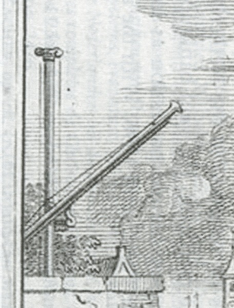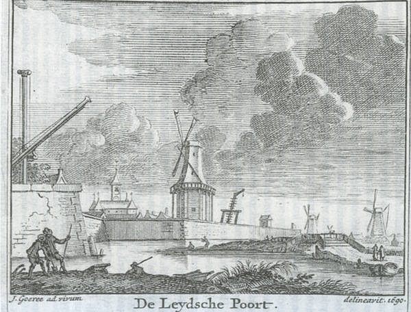 A view on Amsterdam's bastions near the Leiden gate. On the left the "bolwerk Oostdorp" is depicted, with the large Hartsoeker telescope at the edge of the view. Engraving states "J[an] Goeree ad vivum delineato 1690," but this date must be a misprint for 1698, the year in which Hartsoeker settled in Amsterdam. From p. 93 of Willink's Amsterdamsche buitensingel.