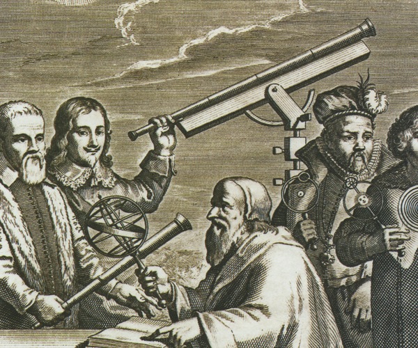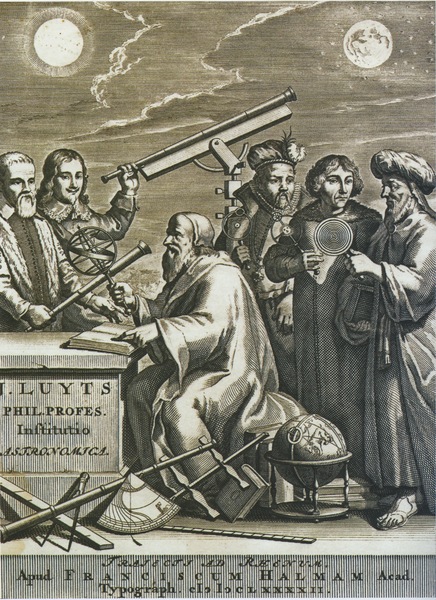 Various astronomical figures cluster around Ptolemy. Galileo (far left) holds a refracting telescope. Beside him a figure (Huygens?) holds the end of a refracting telescope on a mount pointed at the moon.
