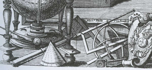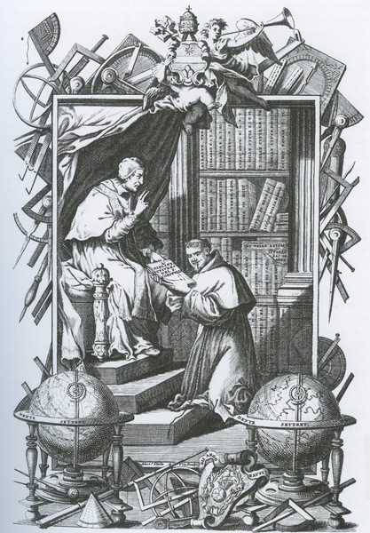 Coronelli presents his work to Clement XI and receives a blessing. Various instruments portrayed around border of image, including large refracting telescope at the bottom border.
