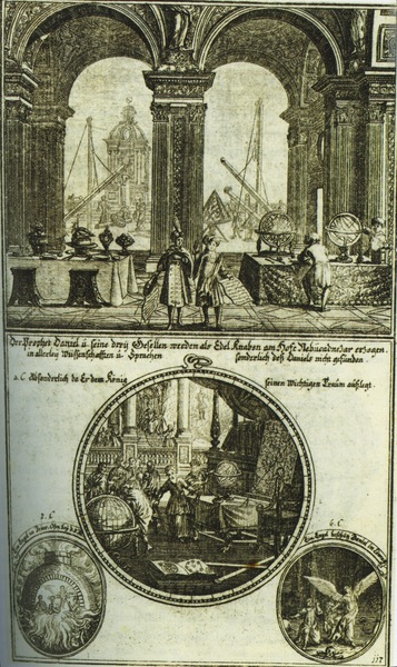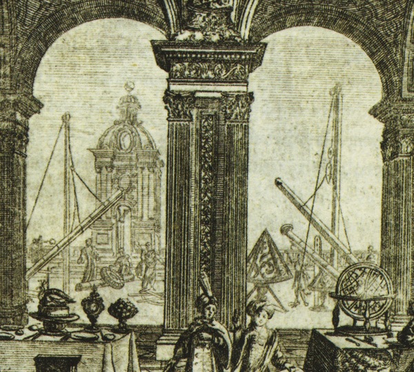 With the possible cooperation of Johanna Sibylla Kraus (Kuesel) and Maria Phillipina Kuesel. In the background three large refracting telescopes on masts point toward the sky.