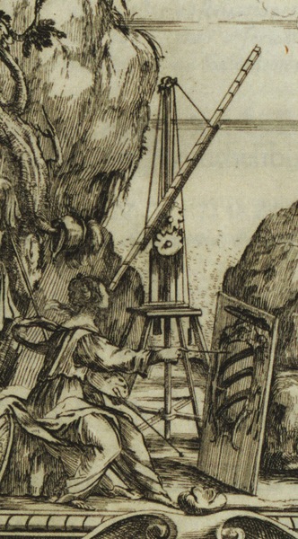 A seated figure observes the satellites of Jupiter through a large refracting telescope on a mast.