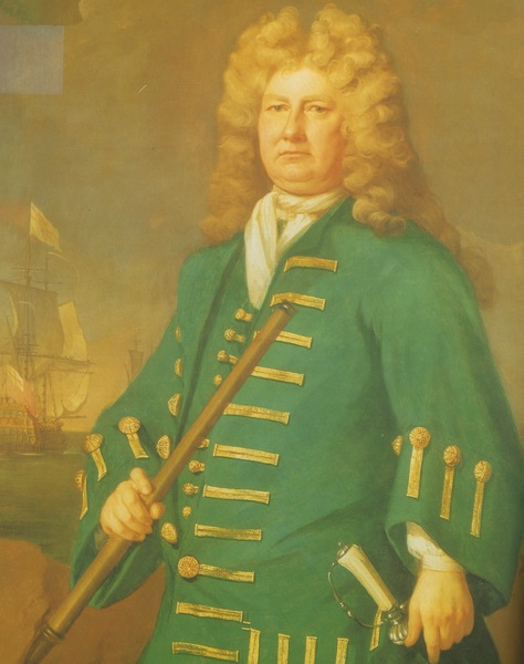 Shovell was rear admiral by the age of 42 and appointed commander-in-chief of the British fleets at 54, in 1704. Depicted holding a refracting telescope (or baton?) in his right hand.