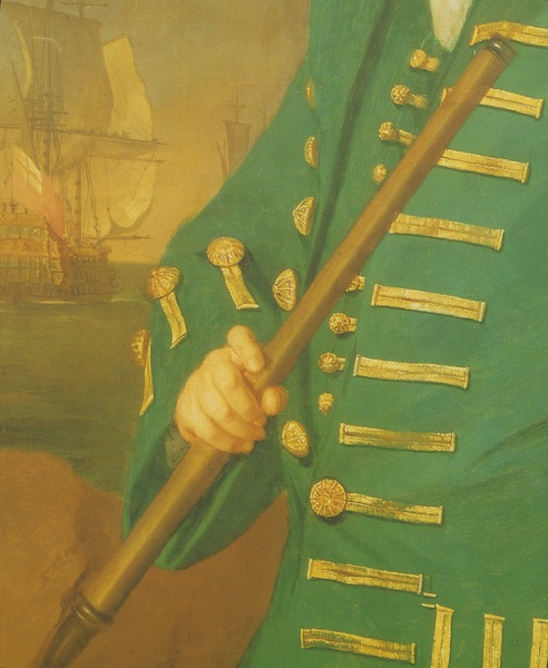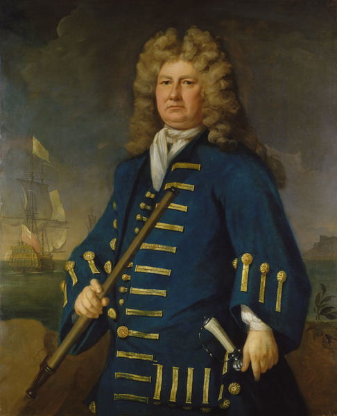 "In the War of the Spanish Succession, Shovell brought home the silver captured by Sir George Rooke at Vigo in 1702. Returning home from an attack on Toulon in 1707, in his flagship ‘Association’, he was lost with over 1300 men when his ship and two others were wrecked off the Isles of Scilly. The Swedish painter Michael Dahl travelled to London in 1682 where he became acquainted with Godfrey Kneller. In 1685, he left for Europe and then returned to London in 1689 where he remained. During Dahl's absence, Kneller consolidated his supremacy as the fashionable portrait painter, although the prolific Dahl was his closest competitor. Politically, Kneller supported the ascendant Whigs, while Dahl was a Tory. The death of Kneller in 1723 left Dahl the principal London portraitist. Shovell is depicted wearing a blue coat and waistcoat with gold buttons and gold embroidered buttonholes, and a fair full-bottomed wig. He has an unusual steel and bone-hilted hanger and is holding a telescope in his right hand. In the left background is a ship with his flag as an Admiral of the White" (Royal Museums Greenwich).