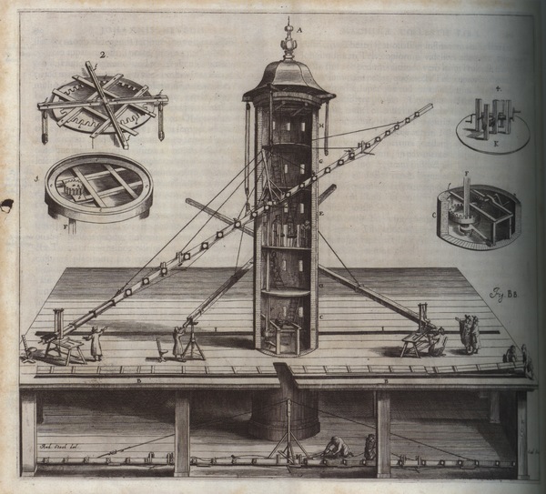 This image is an engraving of Hevelius's observatory, including three large refracting telescopes suspended from supports with an additional long refractor being repaired below the platform.
