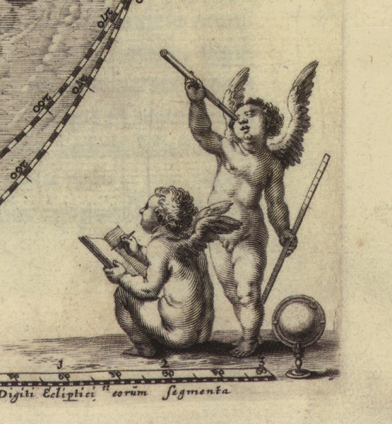 In lower righthand corner of image, a putta observes the Moon through a refracting telescope.