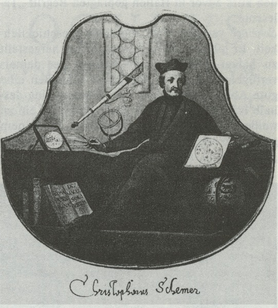 Portait of Scheiner seated holding a picture of the Moon. Behind him a refracting telescope is pointed out a window.