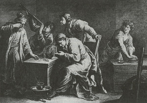 Depiction of the process of producing lenses and optical apparatus. In the background, a man gazes through a refracting telescope.