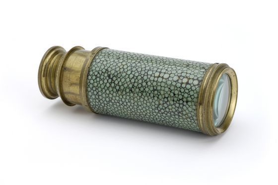 "The wooden barrel of this Galilean telescope is covered in dyed rayskin (shagreen), while the single draw tube is made of brass. A thumbwheel on the eyepiece allows the viewer to select one of four lenses of different magnifying powers. The lenses are numbered from 1 to 4 and there are numbered stop lines on the draw tube, indicating the optimum length corresponding to each of these lenses. The screw-on cap for the objective lens is missing. The maker's name appears on the draw tube as 'Dollond / London'. This was the firm established by Peter Dollond (1731–1820)" (Royal Museums Greenwich).