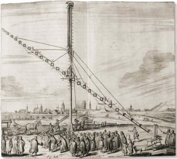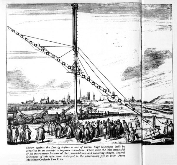 Depiction of Hevelius's 150 ft. refracting telescope suspended from a mast with the city of Danzig in the background.
