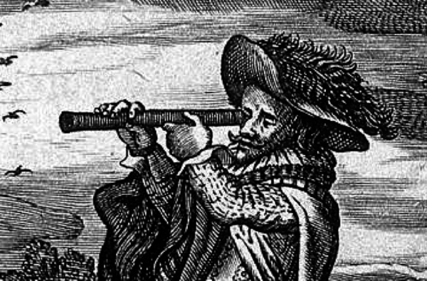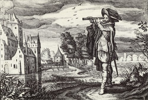 Probably the first Dutch picture of a telescope. An gentleman standing outside a city, holding a refracting telescope to his eye. Not making astronomical observations.
