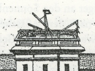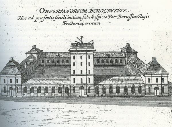 Caption reads: OBSERVATORIUM BEROLINENSE. Hoc ad praefentis feculi initium fub Aufpicio Pot: Boruffiae Regis Friderici erestum. Image of building with refracting telescopes supported by masts visible on ceiling of main tower.