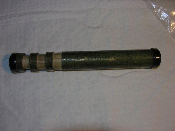 "English telescope with tubes made of pasteboard. The main tube and the ferrules are covered with green parchment, with simple gold tooling. The stamp used resembles Turner (1966), no. 27. Three drawtubes covered with white vellum. The end pieces are made of lignum vitae or pock wood. The eye lens is not original. Length 23-60 cm, Ø 3.5 cm. Unsigned, but convincingly identified as manufactured in England. According to Rudd (2005) this instrument is one of the oldest preserved English telescopes, dating from the third quarter of the seventeenth century.