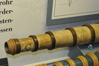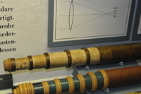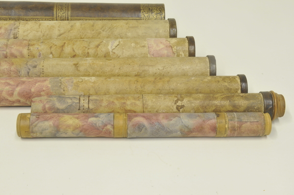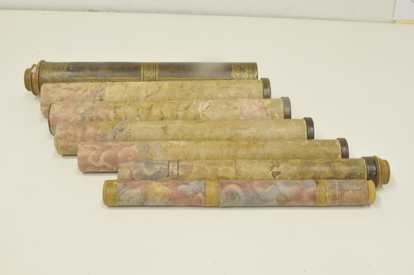 Draw 2 has beveled wood stop eyeside. Equally-spaced 3-lens eyepiece unit in Draw 5. Draws lined in paste paper. Tube measurements: 390 mm (Main tube), 257 mm (tube 1), 259 mm (tube 2), 257 mm (tube 3), 261 mm (tube 4), and 276 mm (tube 5).