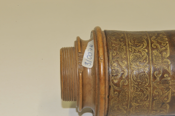 Objective Note: Objective recessed within wooden cell, free aperture reflects opening on cell, to which end cap would screw on. End cap missing.