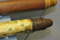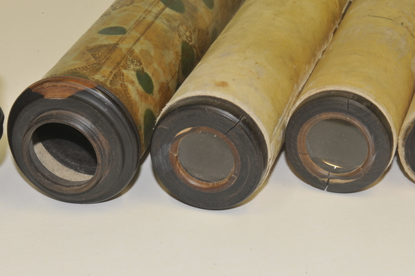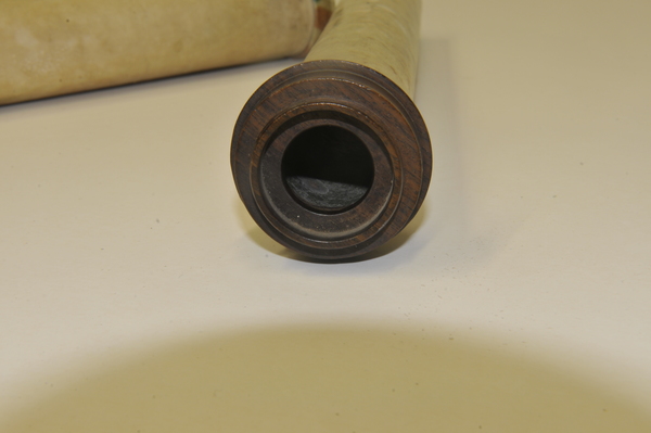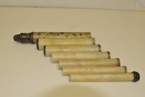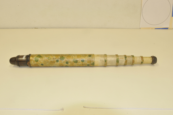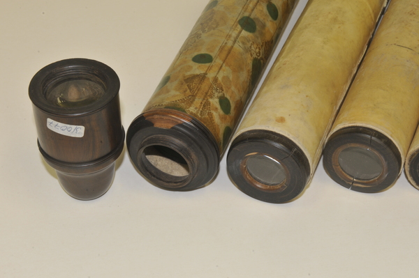 Reverse taper. Three-lens ocular system: lenses on eyeside of Draws 1 and 2, further lens in end piece. Eye relief. Writing (printed English text) visible on starside end of Draw 3. Main barrel length without cells and end eye-relief cap. Additional length of wood eyepiece end 80 mm. Tube measurements: 288 mm (Main tube), 76 mm (draw 1), 146 mm (draw 2), 137 mm (draw 3), 150 mm (draw 4), 131 mm (draw 5), 137 mm (draw 6).