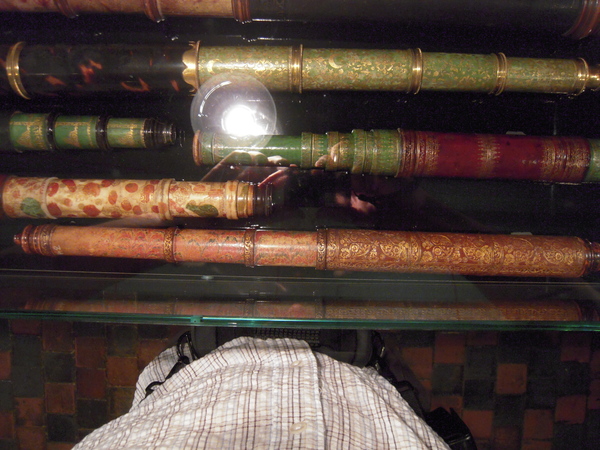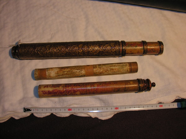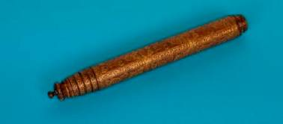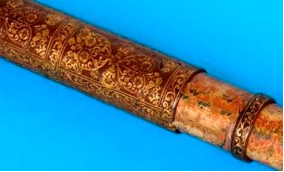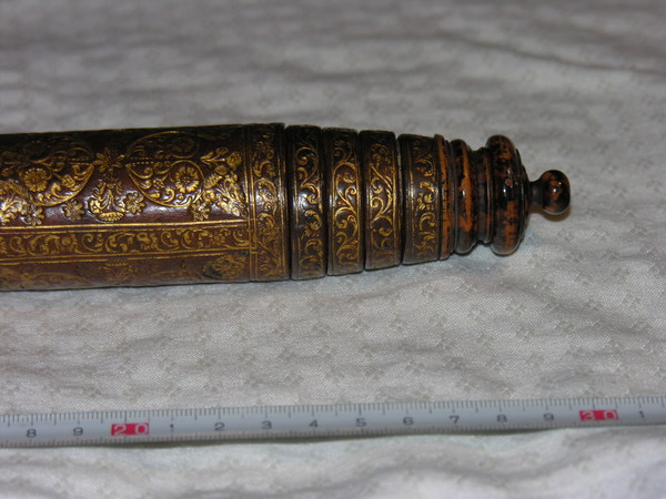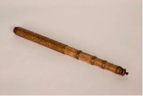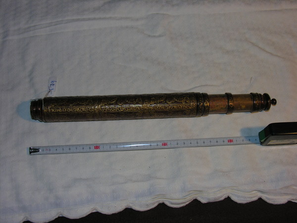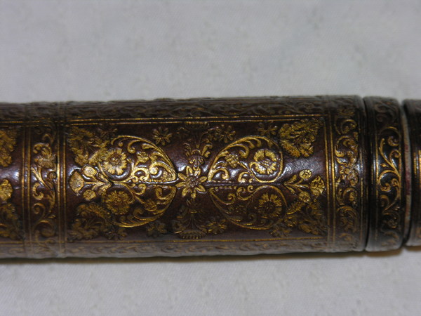 "Presumably Italian telescope. Main tube and ferrules covered with brown leather, richly decorated with gold tooling. Four pasteboard drawtubes, covered with marbled paper. Length 31-92 cm, Ø 4 cm. Unsigned. Estimated to be made in the last quarter of the seventeenth century" (Louwman and Zuidervaart, 2013).