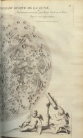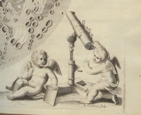 In lower left, a cherub holds a small refracting telescope. In lower right, another cherub views through a binocular telescope on stand.