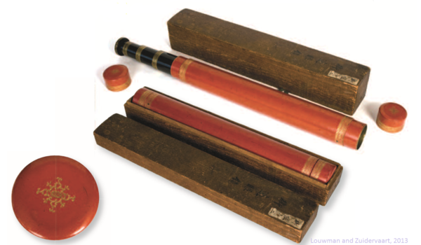 "Japanese telescope. Red lacquered main tube, with three black lacquered drawtubes signed by Iwahashi Zenbei. Length 230 cm, Ø 9.5 cm. Marked in Japanese characters: ‘First month of the year of the Dragon’ (which is 1784 or 1796). With rectangular wooden case.