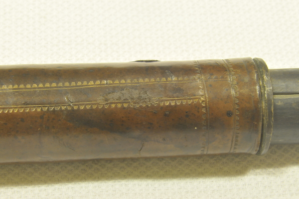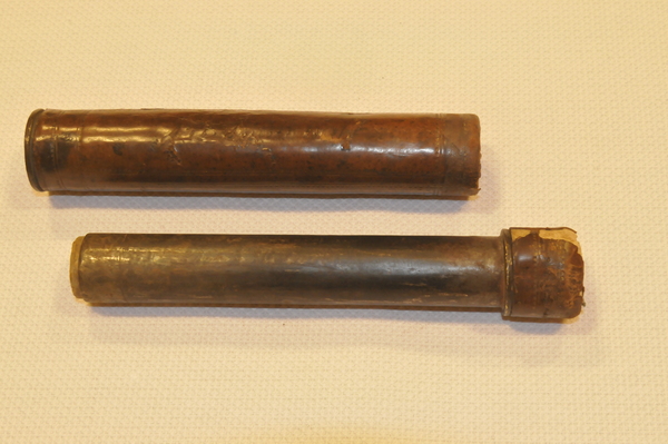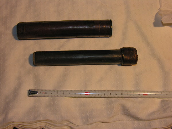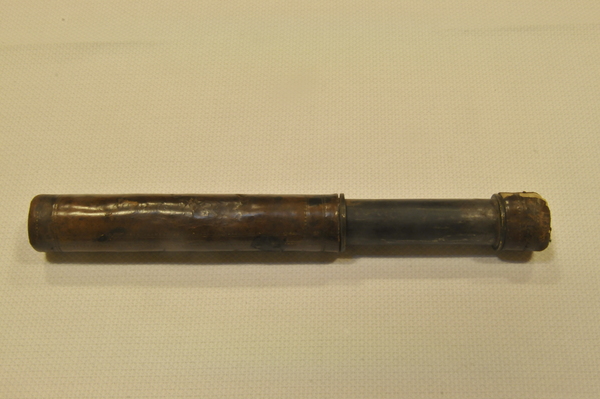 Tubes made of thick metal and outer tube covered in old brown calf leather, inner tube has brown paper. Both tubes of tin. Objective is replaced, it has the wrong focal length and is very fuzzy. Eyepiece is plano concave. It is not confirmed but it is suspected that it is from Belgium or Germany, earlier from weapons dealer. Very old-- could be pre-1620.