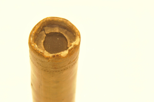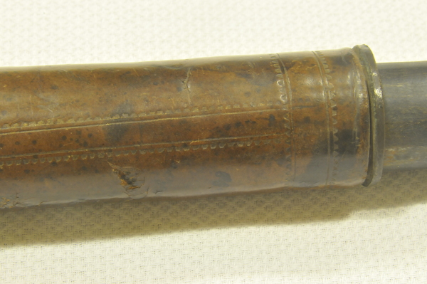 The main tube (with a length of 16 cm, Ø 3 cm) is covered with brown leather, blind-stamped with simple fillets, representing a line with four outfacing triangular motifs. The leather handgrip of the drawtube has the same diameter as the barrel. Length 16.5-29 cm. A virtually illegible inscription in iron-gallnut ink is written on the tube, probably the signature of a former owner. When the instrument is photographed in infrared light, it appears that the ink is not carbonaceous, so that the signature doesn’t stand out. The edge of the double convex objective (Ø 2.5 cm) is irregularly formed. Its glass has many air-bubbles. The (not original?) plano-concave eye lens is retained behind a 3.0 x 0.2 cm brass ring collar. Presumably first half of the seventeenth century" (Louwman and Zuidervaart, 2013).