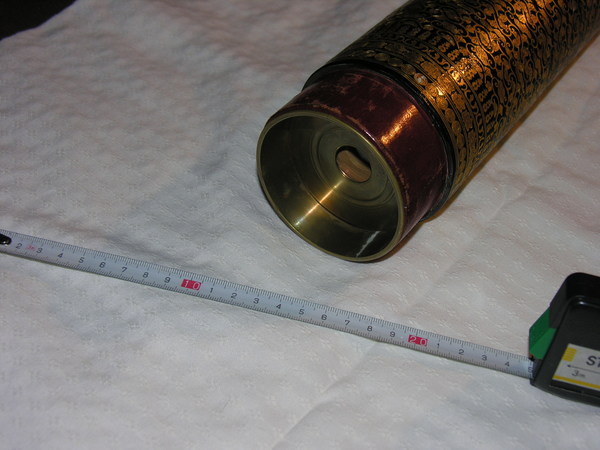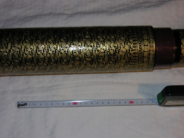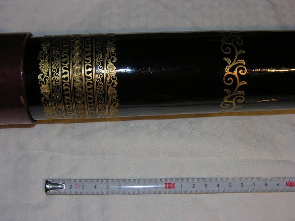 "Japanese telescope. Black lacquered main tube made of cedar wood, with three black lacquered drawtubes. Rich gold tooling. With protective caps and wooden casing. Length 47/124 cm, Ø 8 cm. Unsigned. First half of the nineteenth century" (Louwman and Zuidervaart, 2013).