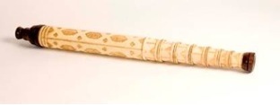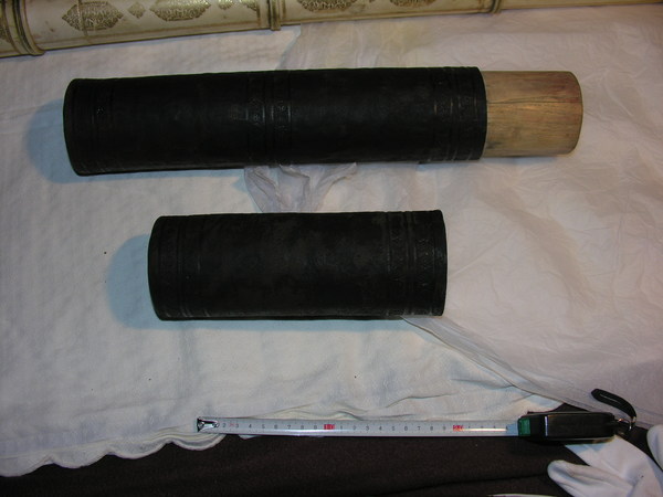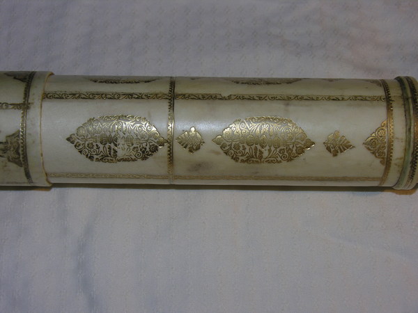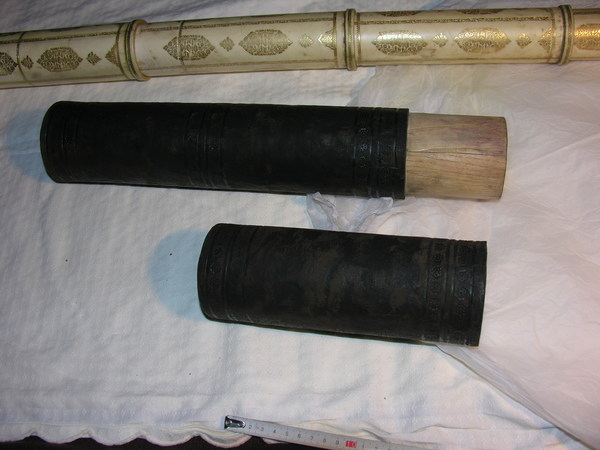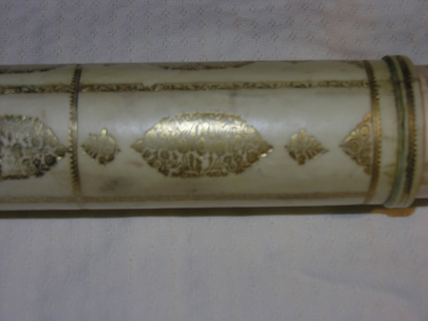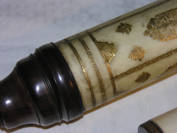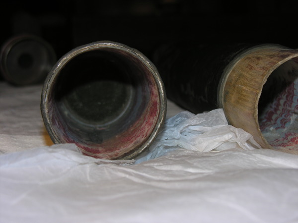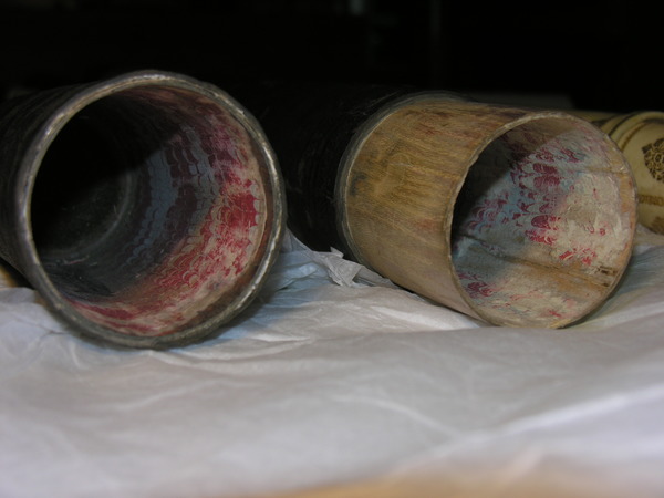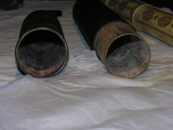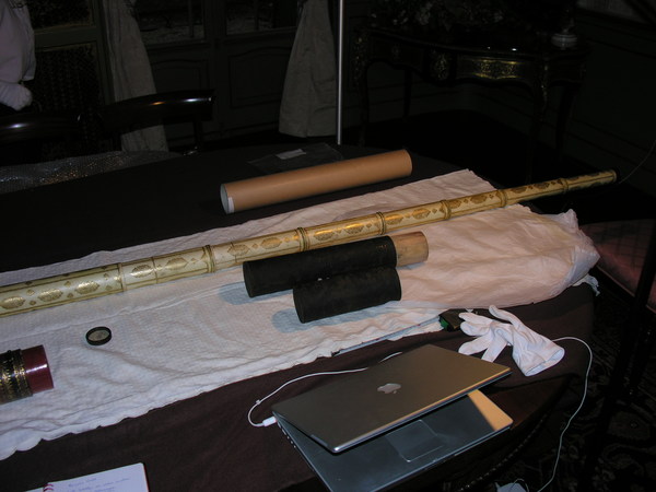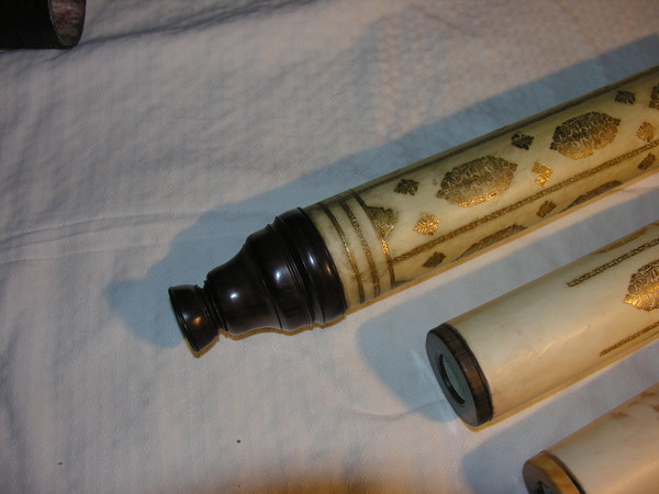 "English telescope (reverse tapered). The main tube is covered with white parchment with rich gold tooling, resembling Turner (1966), nos. 20b & 71/72. Seven drawtubes. The original storage tube has been preserved with the instrument. Signed on this barrel: ‘JOHN: MARSHALL * LVDGAT: STREET * LONDON’. Length 1.83 cm, Ø 7 cm. Ca. 1700.