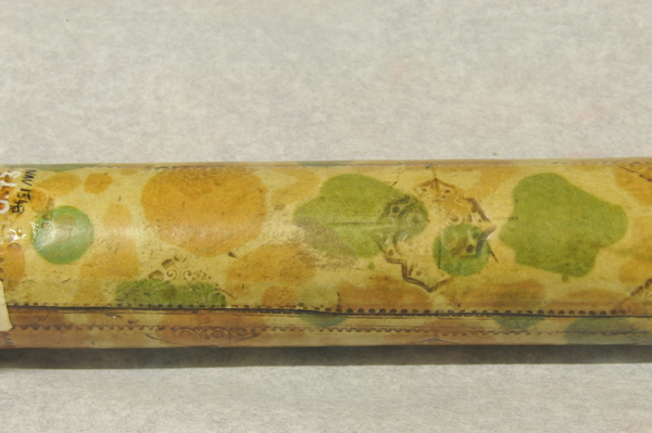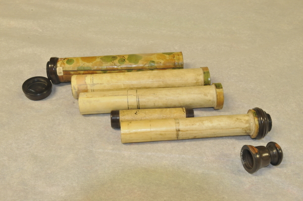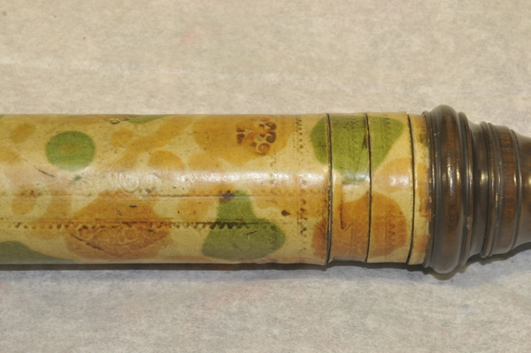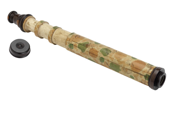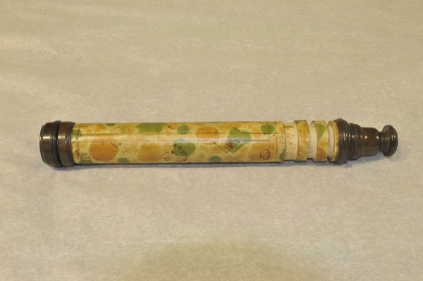"This non-achromatic telescope has a barrel made of mottled vellum with gold-tooled decoration. The three draw tubes are of plain vellum and have black stop lines drawn onto them, indicating the working length of the telescope. The turned wooden fittings include a screw-on objective lens cap. The ferrules or collars of the draw tubes were made by cutting sections from the tube that made the barrel - they are of the same diameter and the mottled pattern matches that of the barrel. This suggests that the telescope was made earlier than 1660" (Royal Museums of Greenwich).