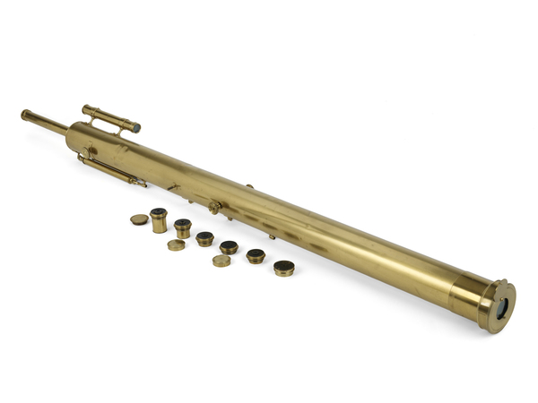 "This is a brass double achromatic telescope, with a missing tripod stand. The telescope has a fitted mahogany box which contains in addition to the telescope tube a counterpoise clamp, object glass cap, small refracting sighting telescope (mounted on the eye end of the barrel), six eyepiece shades (two with caps), a terrestrial eyepiece, fittings for supporting the telescope. The telescope has an object glass diameter of 95mm and a focal length of 60 inches. The mahogany box has an overall length of 1677mm and has brass handles" (Royal Museums Greenwich).