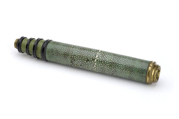 "The barrel of this non-achromatic telescope is covered in rayskin (shagreen) that has been dyed green, and the three draw tubes are made of green vellum. Black stop lines marked by rings of dots on the draw tubes indicate the optimum working length of the telescope. The black ivory and brass fittings include sliding eyepiece and objective lens covers" (Royal Museums Greenwich).