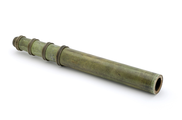 "This is not a complete telescope, it is four draw tubes from a larger example. The surviving tubes are made of vellum, while the brass fittings include a sliding eyepiece cover. Stop lines, mostly rings of dots, on the draw tubes, indicate the optimum working length of the telescope. The barrel and objective lens, and perhaps some other draw tubes, are missing. This would have been a non-achromatic telescope" (Royal Museums Greenwich).
