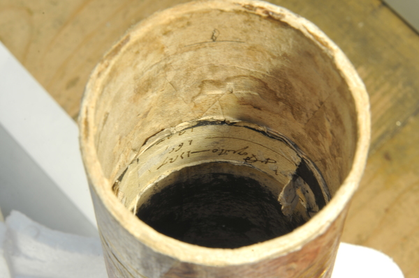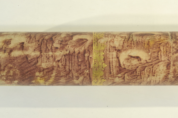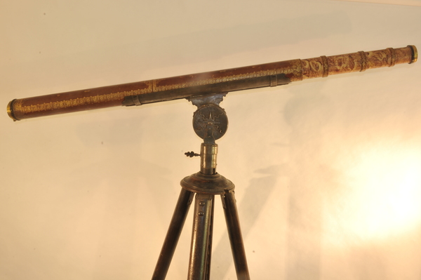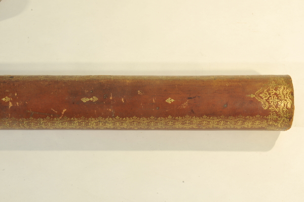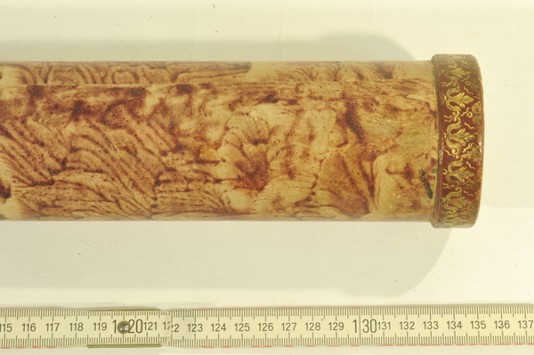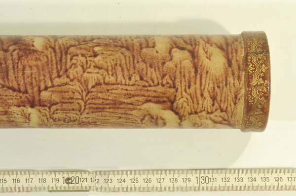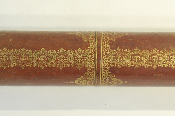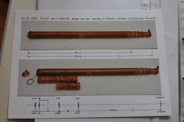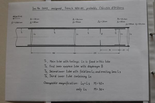 Only known 4 lens reverse taper. Wallpaper kliester indicates French or Italian origin. Unusual in that most reverse tapers are English. Point of reverse taper is that large eye lens gives large field of view. Possible maker Cherubin d'Orleans but no evidence. Tooling is unique, nothing similar has yet been found. Early Campani is combed marble. Later have some wallpaper marbling. De Rheita establishes the idea of a reverse taper, but d'Orlean makes it better known. De Rheita also proposes the idea of using two eye lenses in order to increase the field of view. De Rheita specialized in binoculars, and d'Orleans, Patroni, and Bailloui make them on the same principle. Large end at the eye, just like a reverse taper. Ends of tube are worn. Proportions in keeping with "La dioptrique oculaire" by Chérubin d'Orléans, père, 1671. Four eyepiece, chromatic compensation (by chance). Erector and field lenses all placed in tube in last 400 mm of main tube (see schematic in RW 1996 Annals of Science Paper).