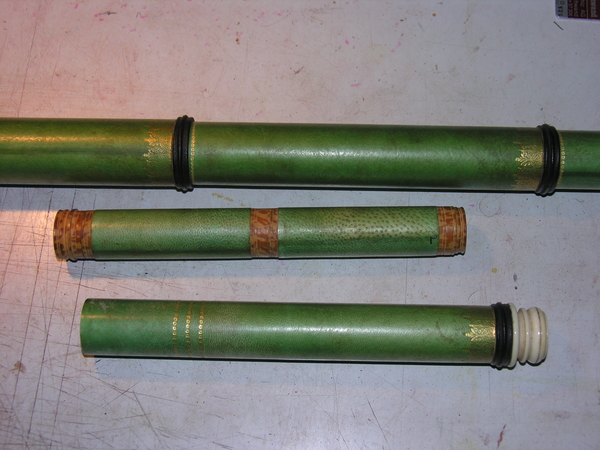 Wood tubes rather than paper. Has a leather case (current condition: sticky with holes). Green leather tubes, with rayskin on main tube, and ivory end caps. Two nearly identical signatures, one on the objective lens and one on the objective cell.