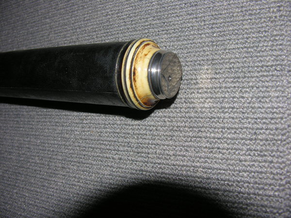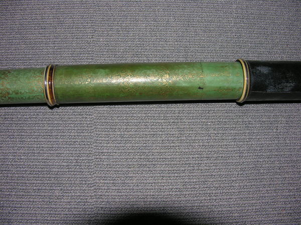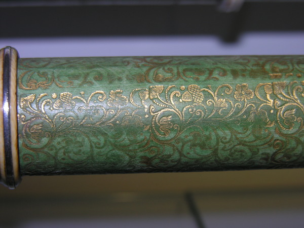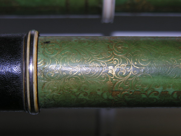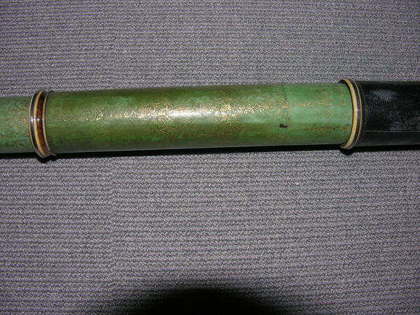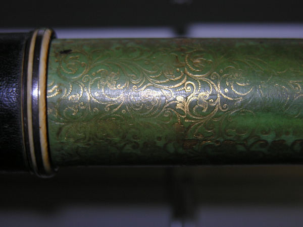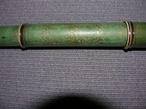 Black tube, English, unsigned. Florid gold tooling on green vellum. Silvered ivory rings, silver cells, sliders.
