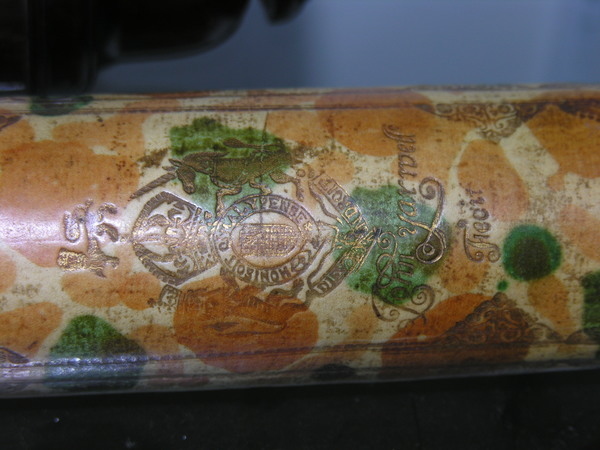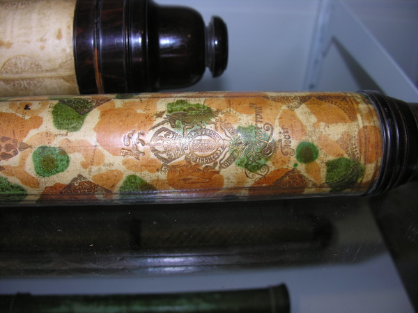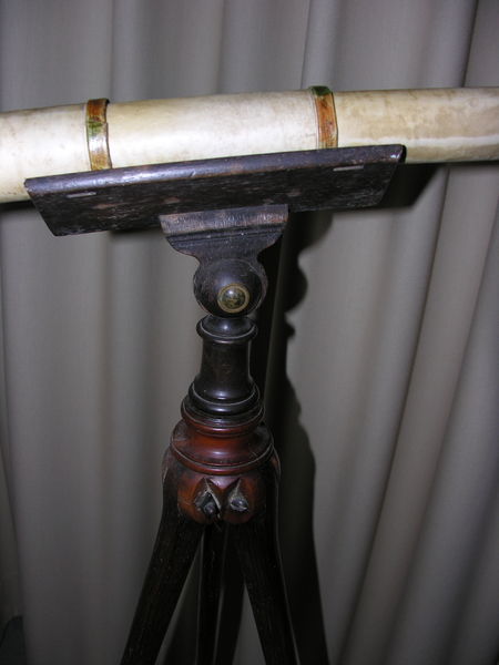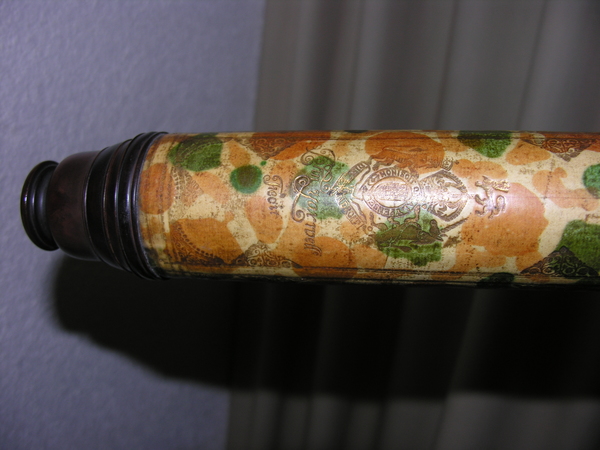 Dates around the end of 17 century. Rare reverse taper, three lens eyepiece, decorated with orange mottling. Magnification is 12. Mount is from the same time period. The tripod legs unscrew in the middle.