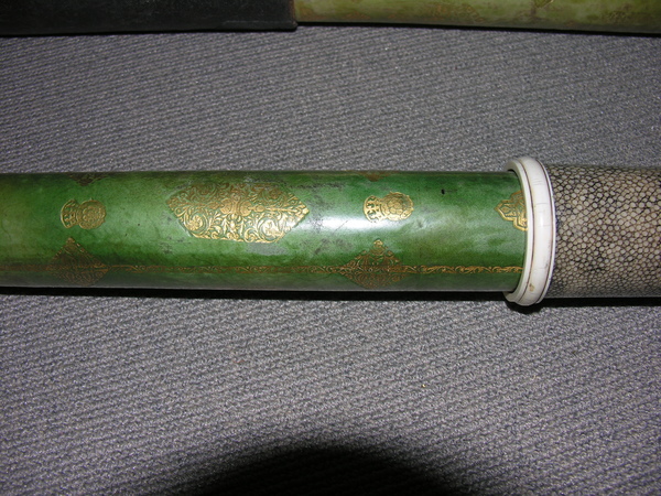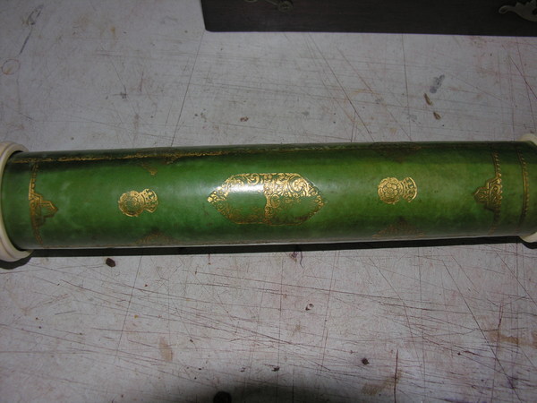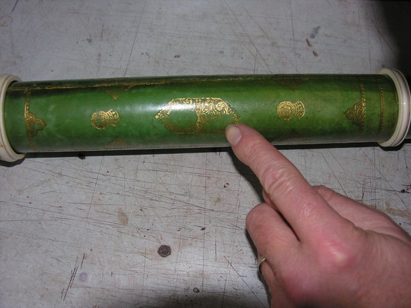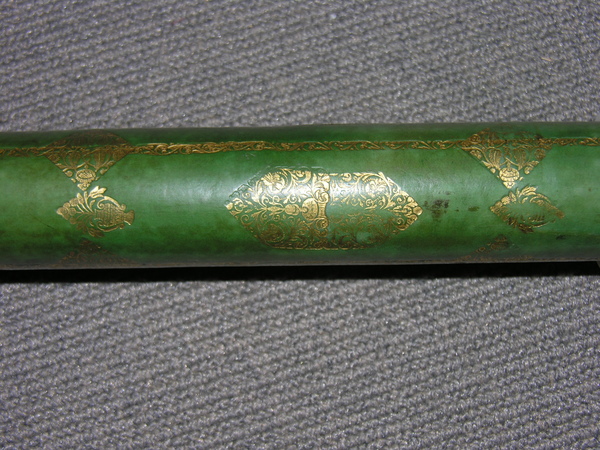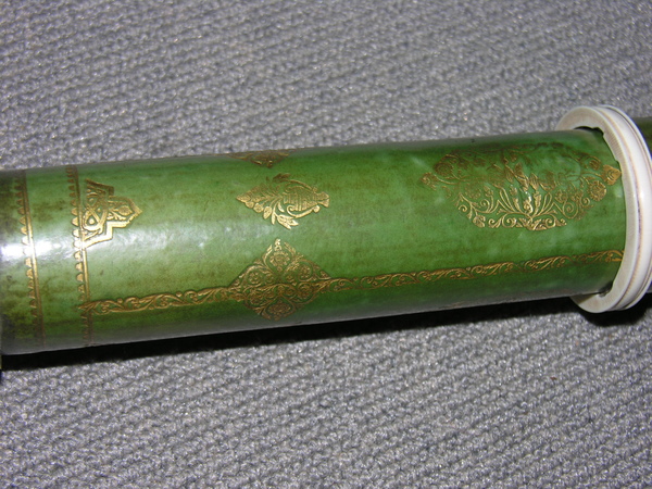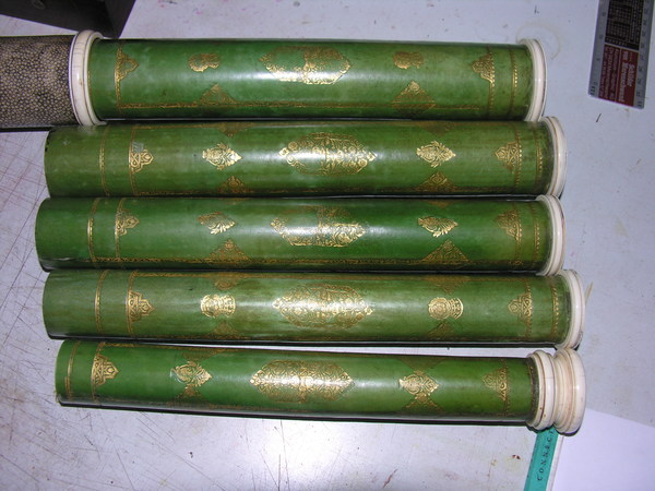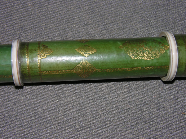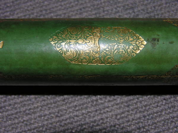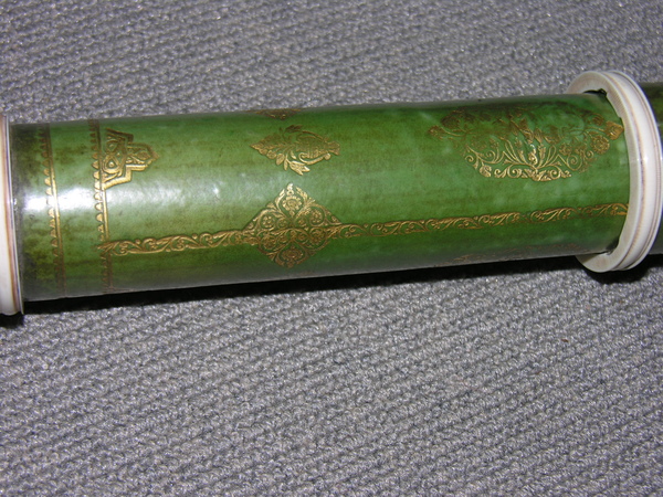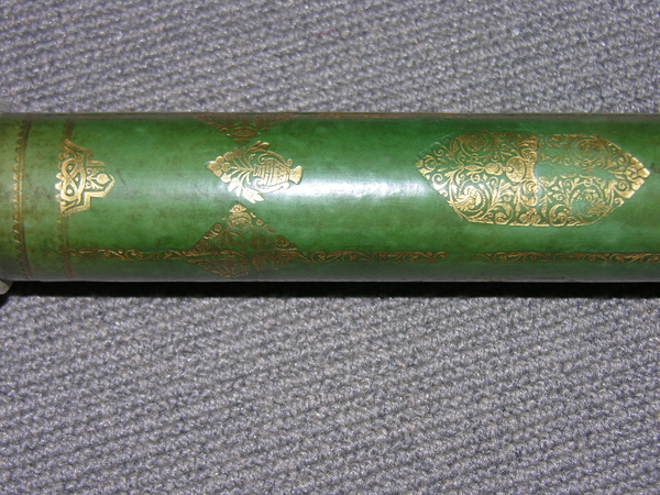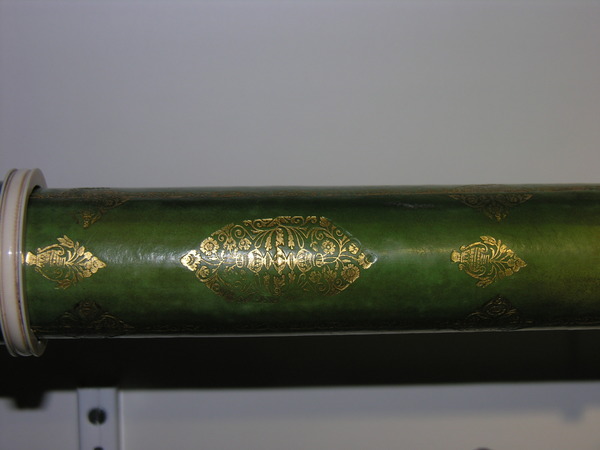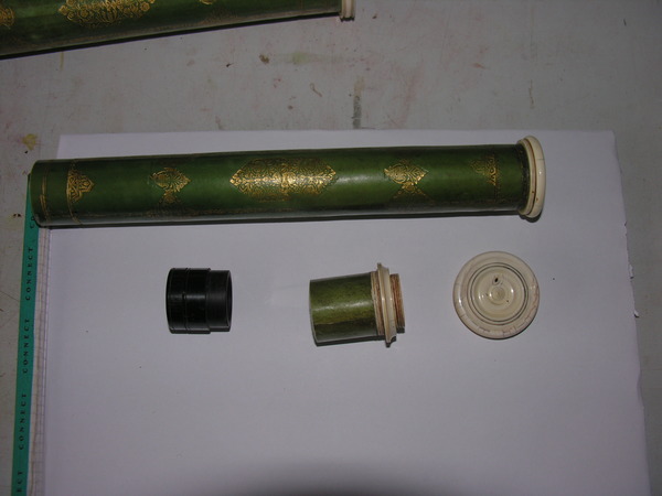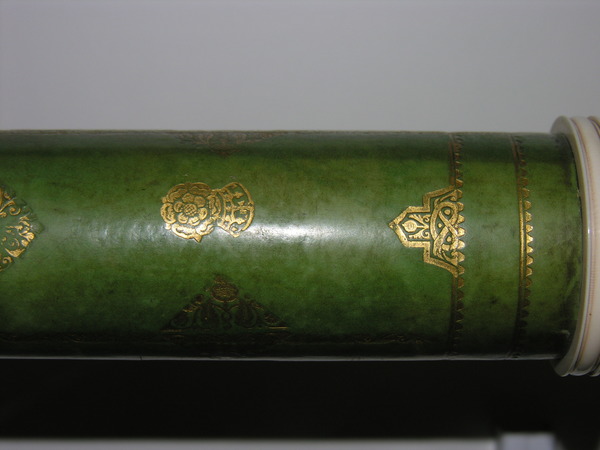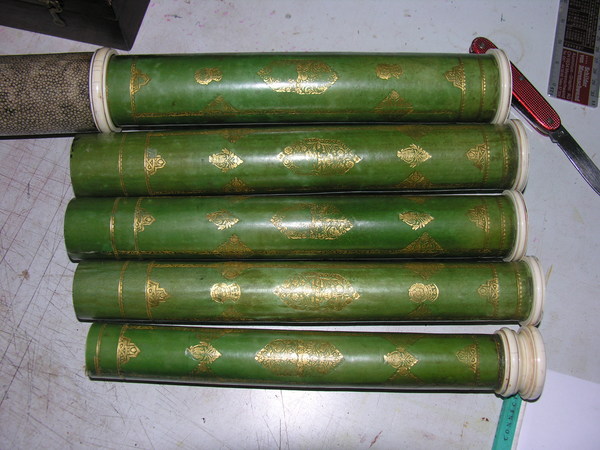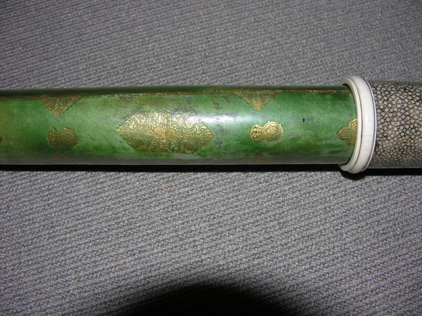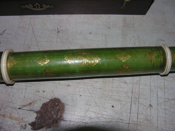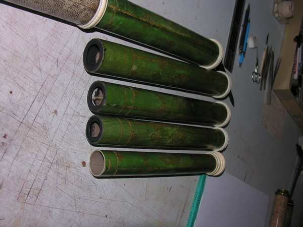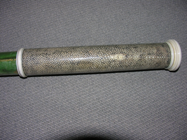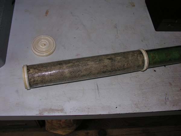 White rayskin with black dye form the Galluchat main tube. This unsigned telescope has ivory rings, and typical English tooling (the tubes alternate tooling styles).