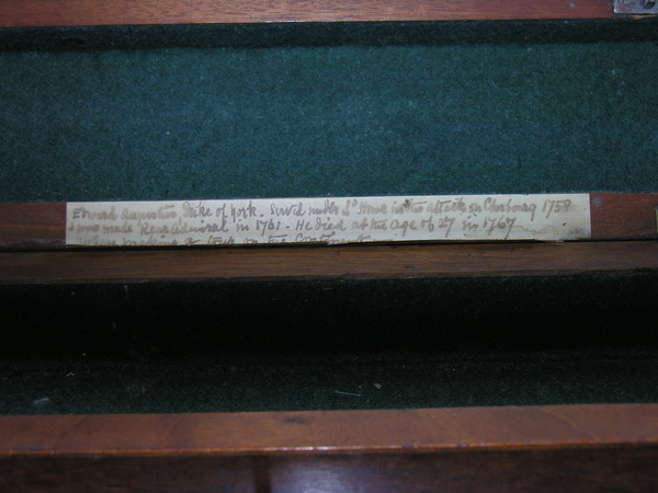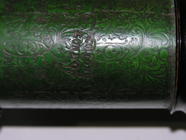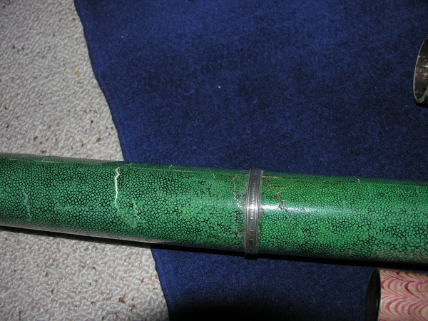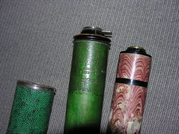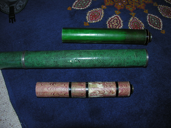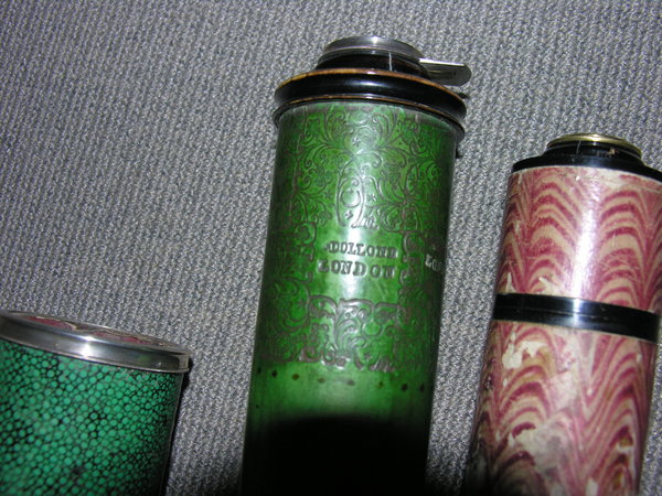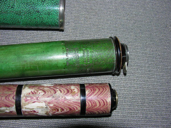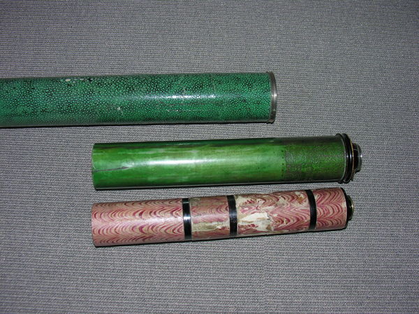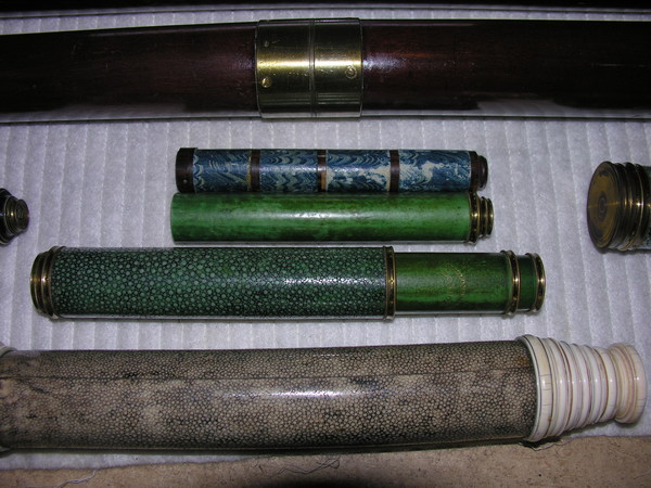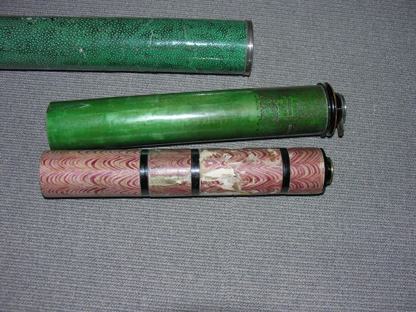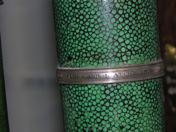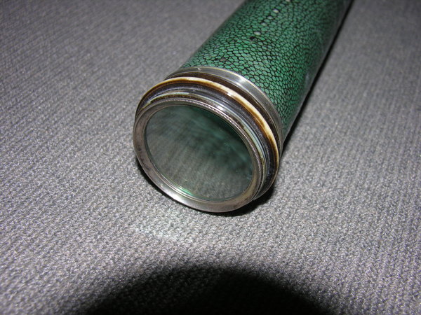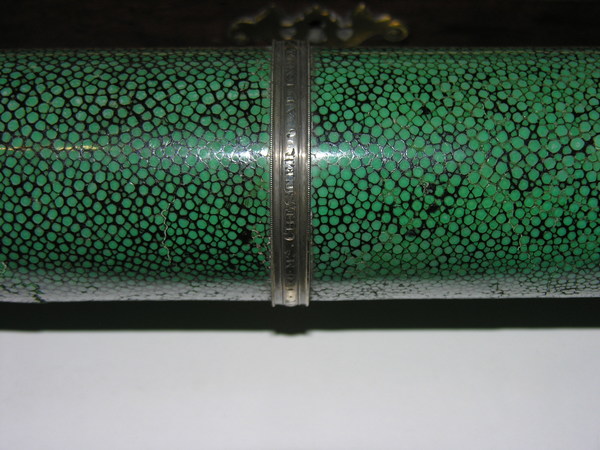 Green rayskin. Rayskin of this size was very expensive, a noble gift. Crown forward. Adams is optician to the king. Dollond is optician to the Duke of York. Scope was gift to Duke's mistress. "HRH Duke of York's present to Mrs Chester at Knole 2nd Aug 1766" Earliest surviving four-lens eyepieces, rendering five-lens eyepiece obsolete. Corrected for spherical and chromatic aberration. Silvered rings, silver on black ivory.