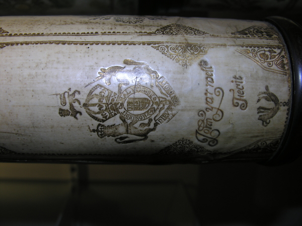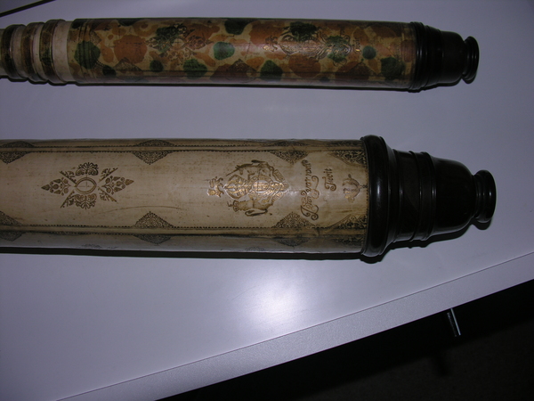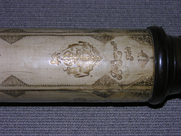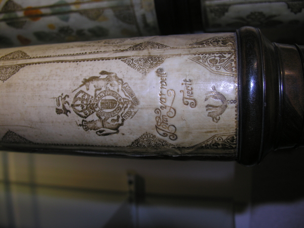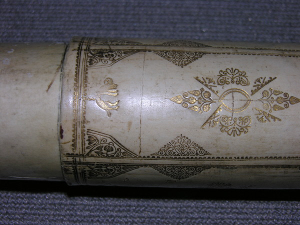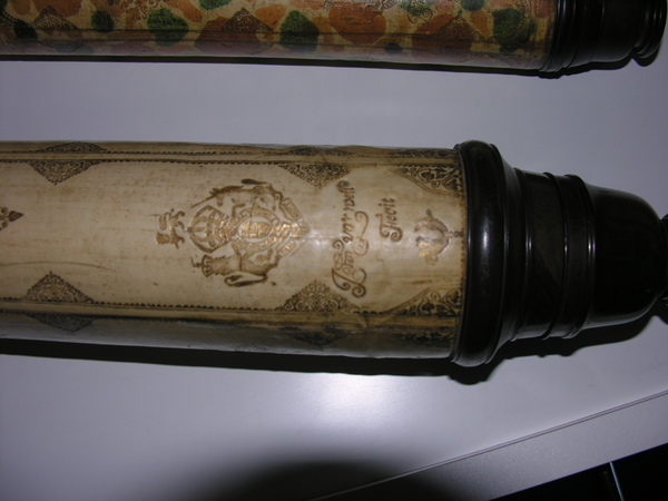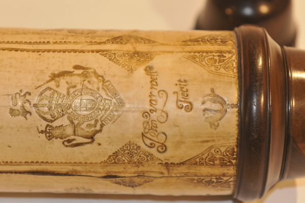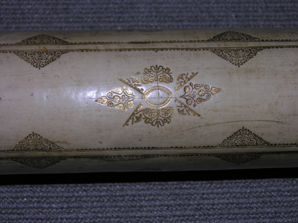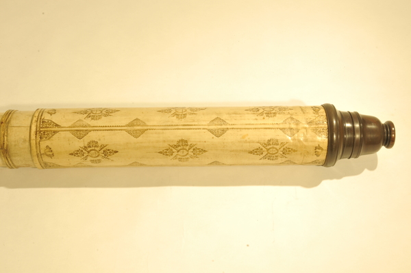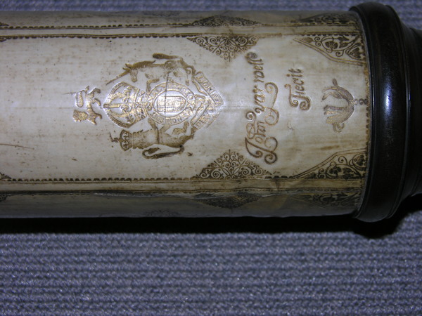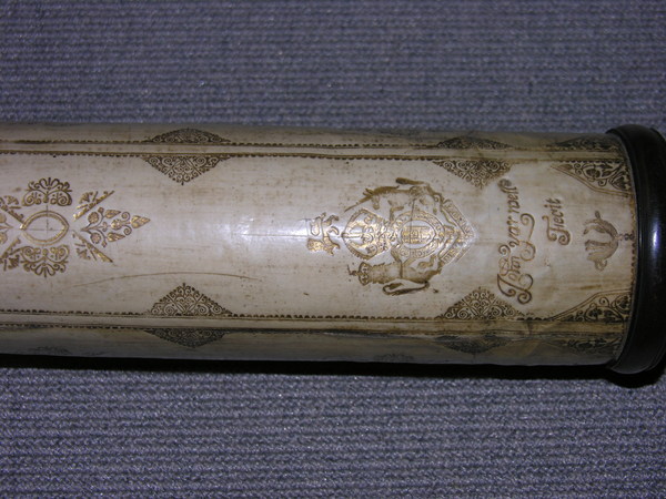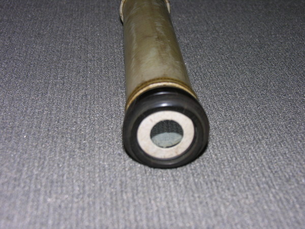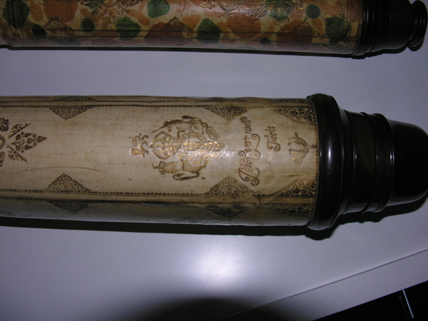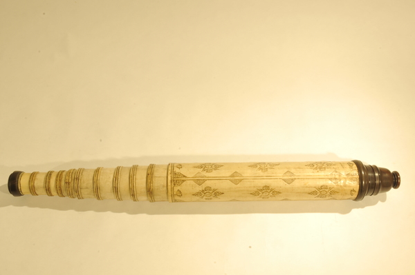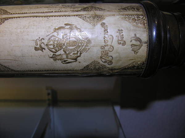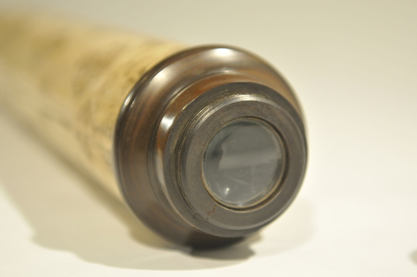 This a reverse taper. This was updated (parts do not always match up) but likely dates to the end of 17c. Signed by Yarwell, Yarwell always signs with coat of arms. Three-lens eyepiece of unequal spacing. Each lens at end of a tube (normal style) Cardboard on draws and main tubes, covered in gold-stamped parchment; ends are lignum vitae, and ferrules also tooled parchment. These ferrules are typical for English telescopes until Dollond starts using wood. Tooling same pattern as Marshall.