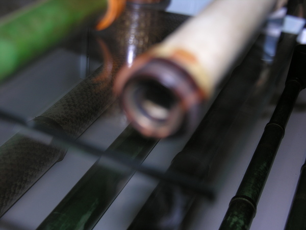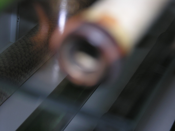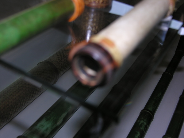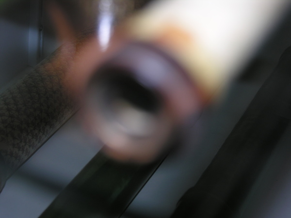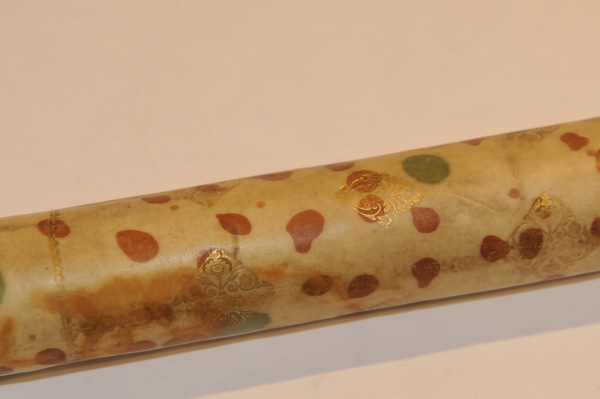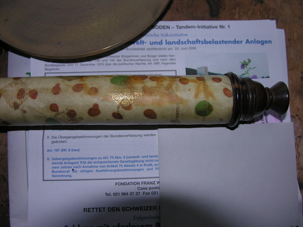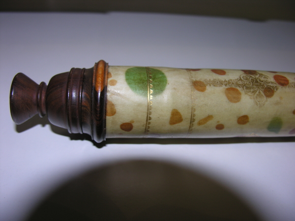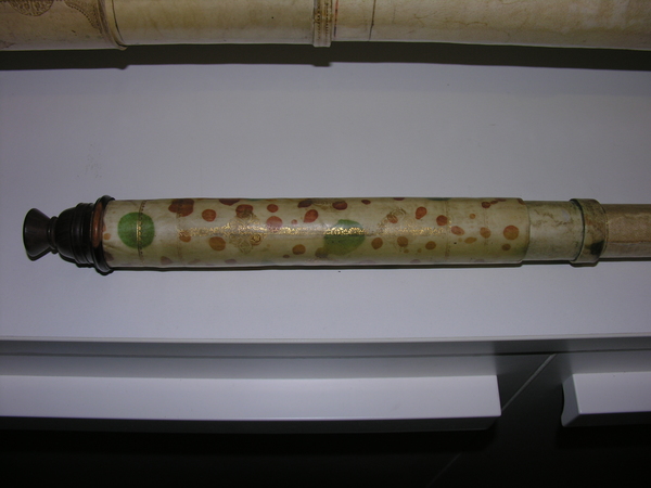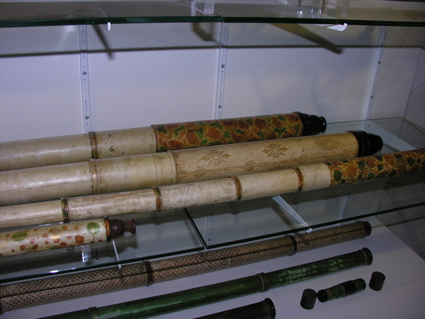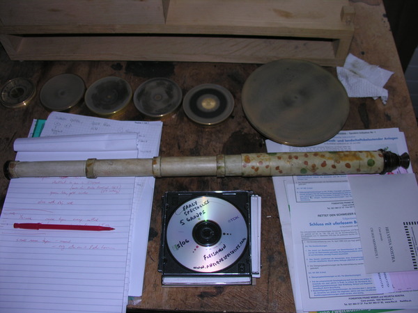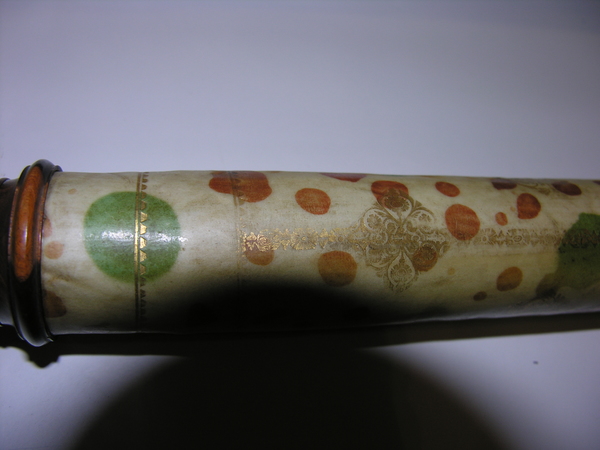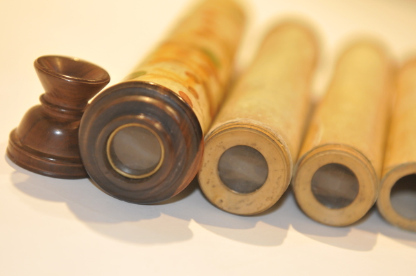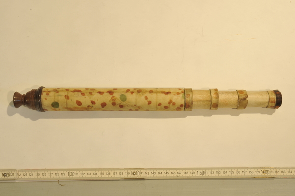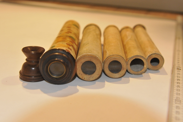 Rare and unusual telescope with a large field of view. Small reverse taper. The first two draws each have lenses on eye-side end (in wooden rings with pressure spring).