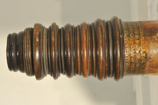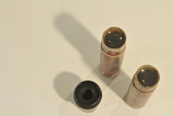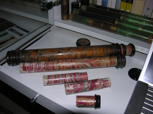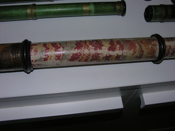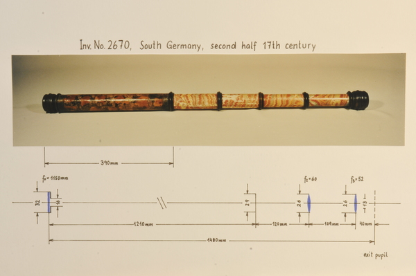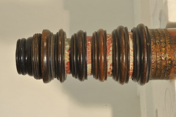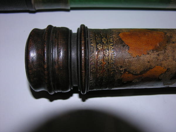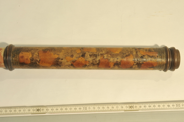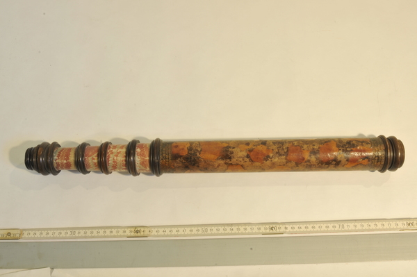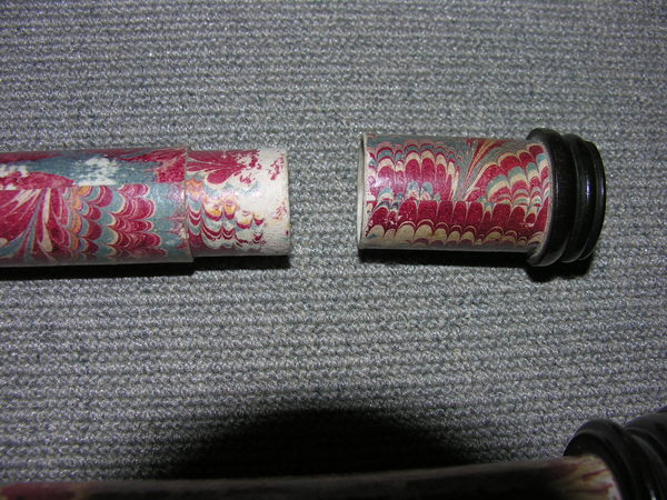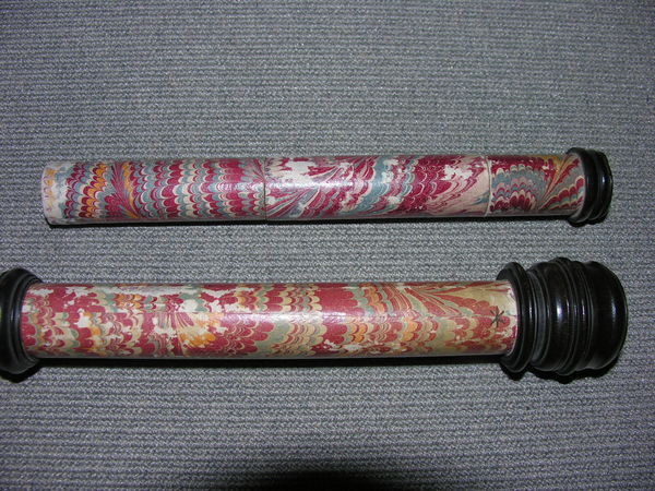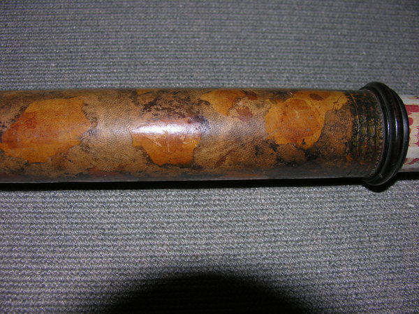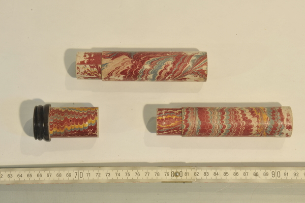 Three part eyepiece, missing field lens. Objective is also missing. Likely cardboard, outer tube has a leather cover, with orange patches of leather inserted. The marbling has deeper and longer swirls approximately every 6 inches. Tooling seems Italian, similar to tooling on microscope in Kassel.