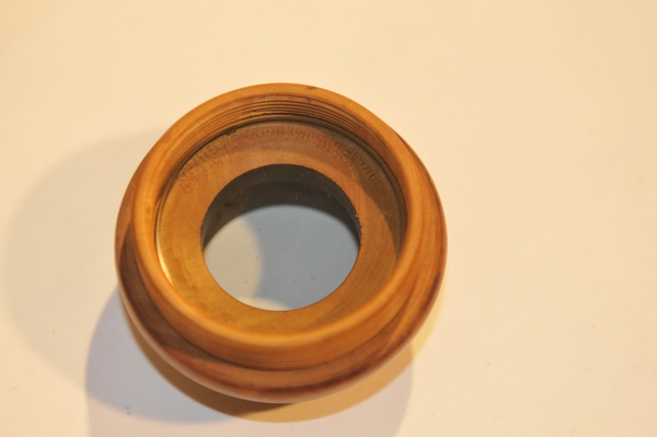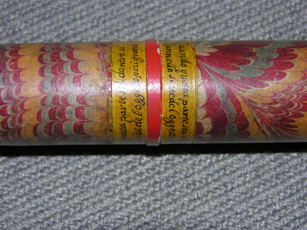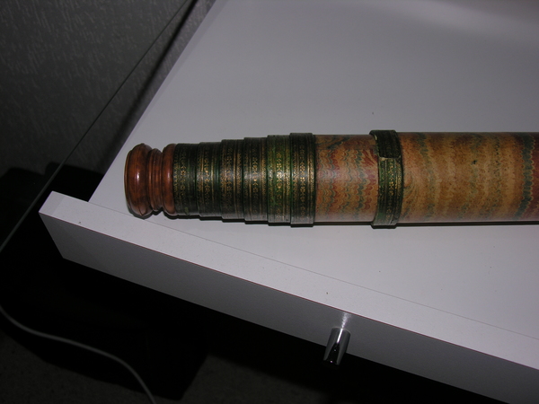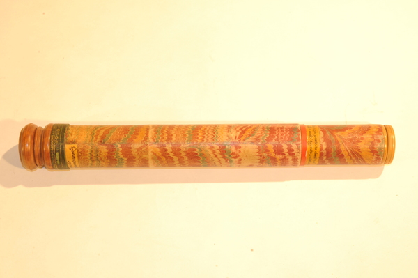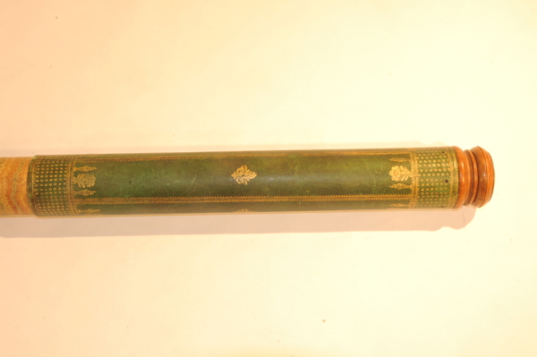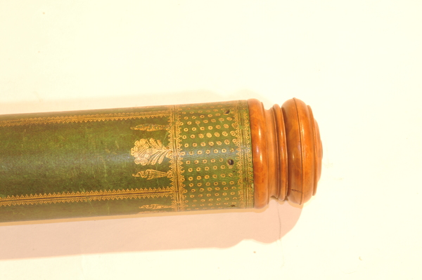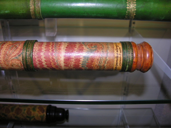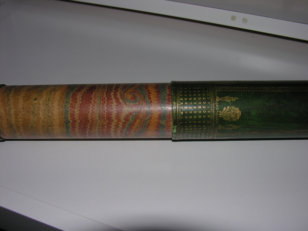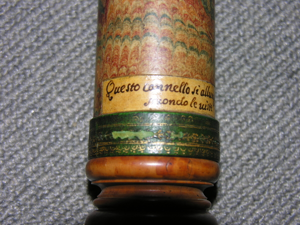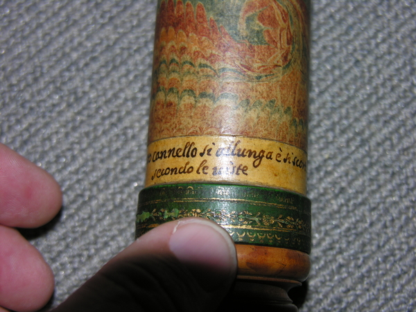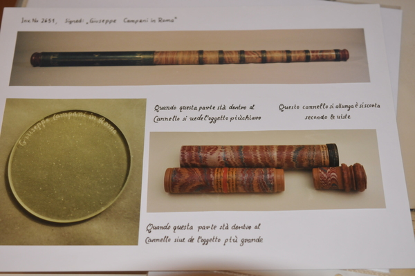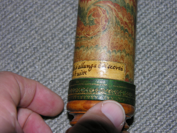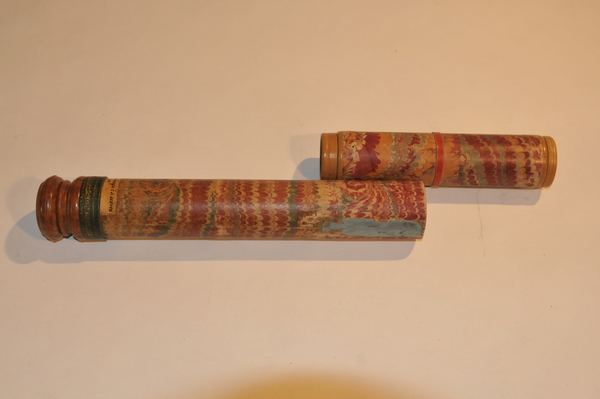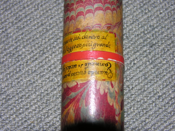 Tubes are wood veneer and green leather decorated with gold circle. Tubes have holes at end for allowing tube to close or open in they are a very tight fit. Objective cell is made of olive wood and has multiple screws. Signature is on the yellowish objective glass. Marble has stick swirling approximately every 6 inches. Almost all Campani scopes have instructions to reverse directions for clearer or bigger, these instructions are on the eyepiece lens system. The eyepiece system in this telescope is a three lens ocular with unequal spacing.