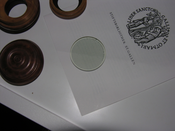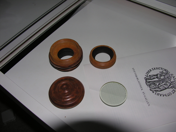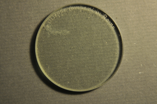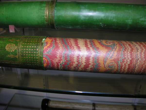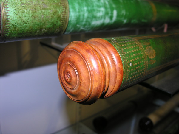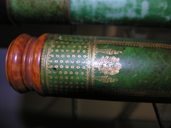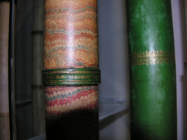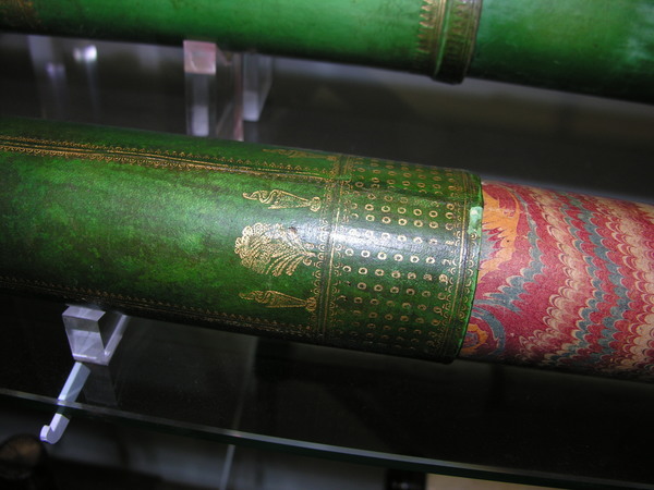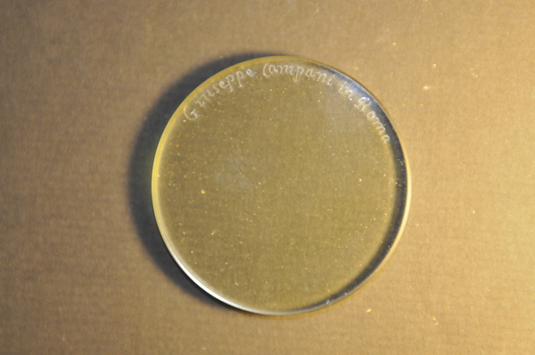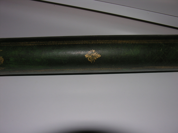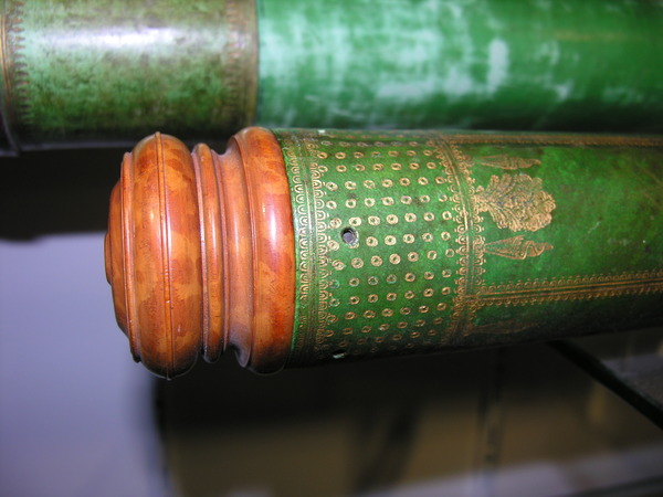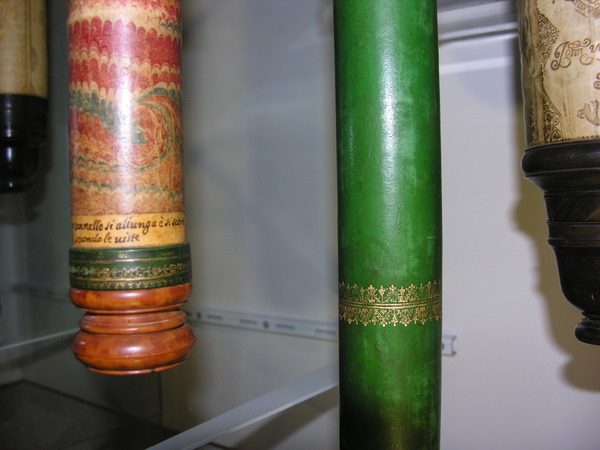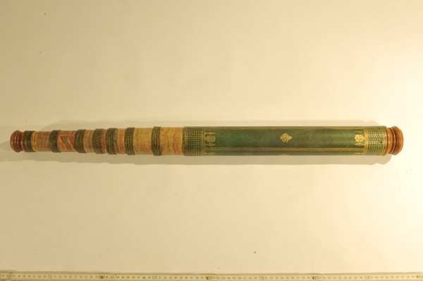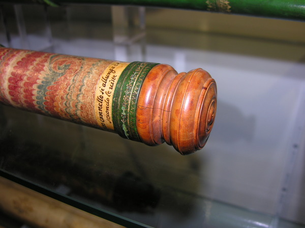 Tubes are wood veneer and green leather decorated with gold circle. Tubes have holes at end for allowing tube to close or open in they are a very tight fit. Objective cell is made of olive wood and has multiple screws. Signature is on the yellowish objective glass. Marble has stick swirling approximately every 6 inches. Almost all Campani scopes have instructions to reverse directions for clearer or bigger, these instructions are on the eyepiece lens system. The eyepiece system in this telescope is a three lens ocular with unequal spacing.