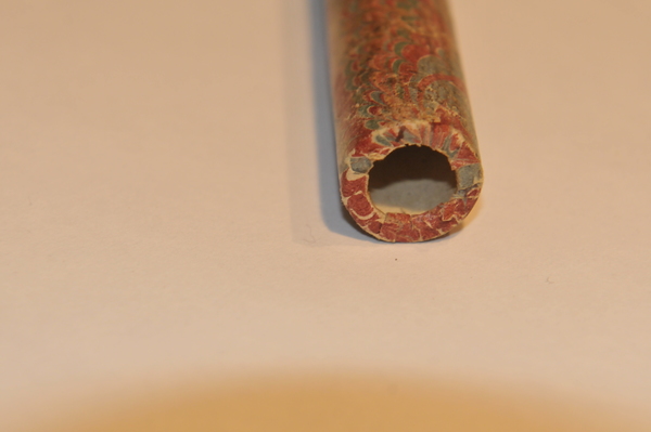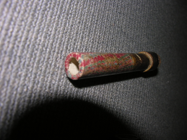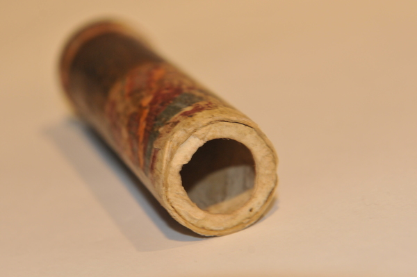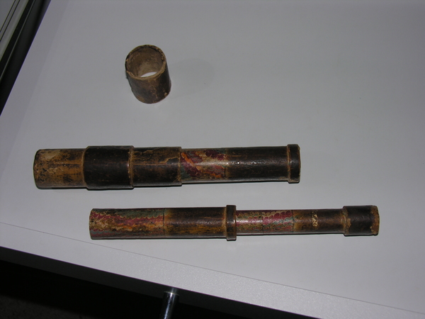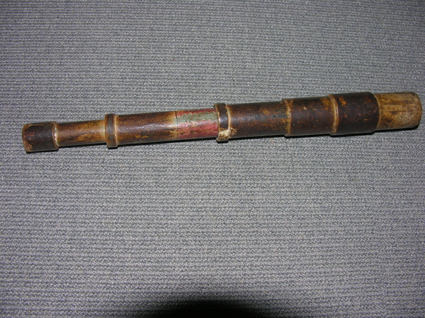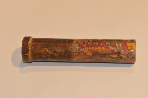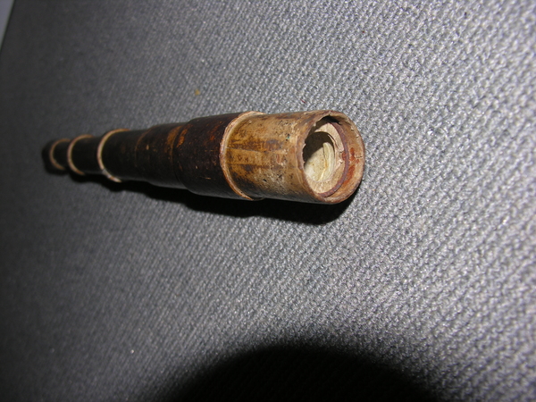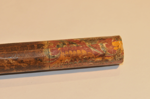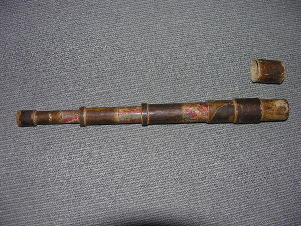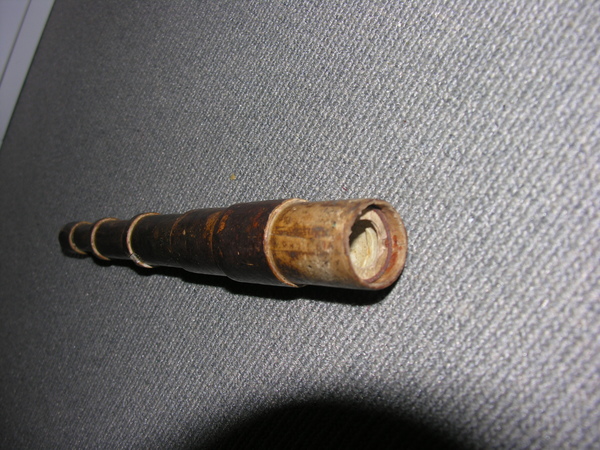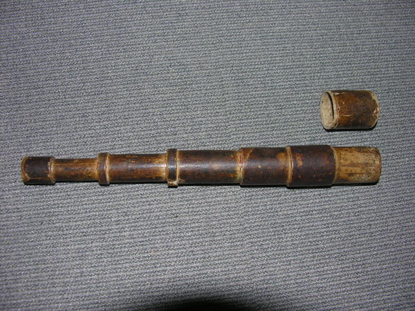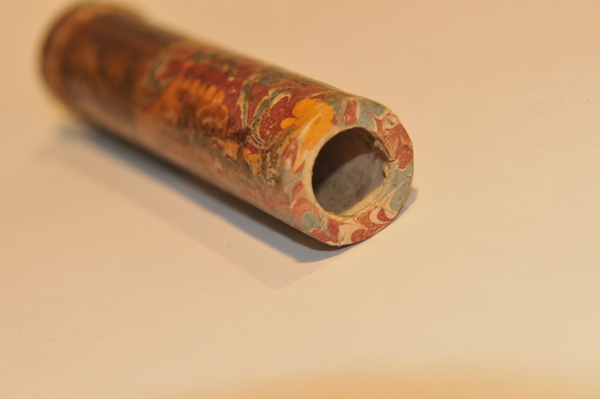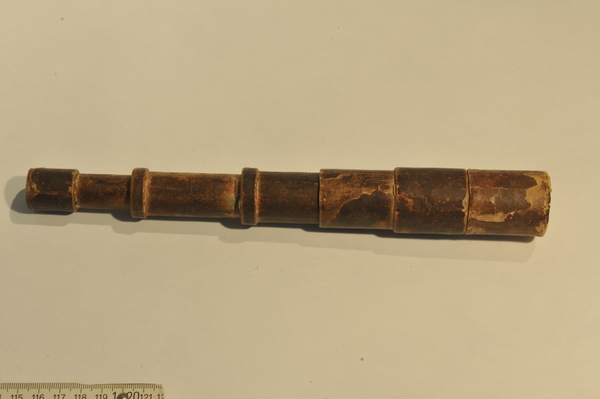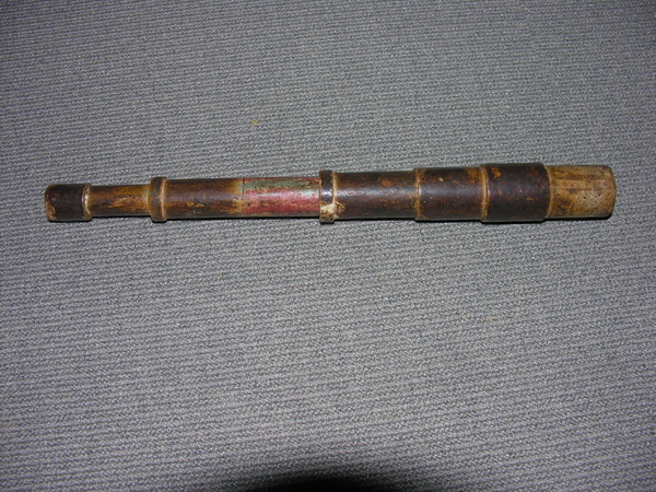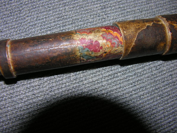 Brown Galilean. Possibly French. End rings get smaller. Wider waves on marbling, typical of 17 c. Sharp points but width is greater than mace ruette. Marbled paper is wrapped around stops. Draws are cardboard, and paper covers are folded over edges. Magnification 4-5x. Lens held in place by spring and paper gasket.