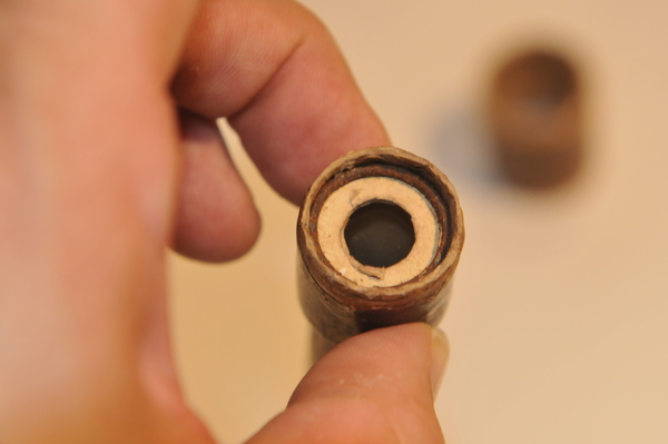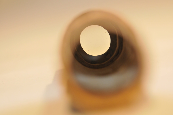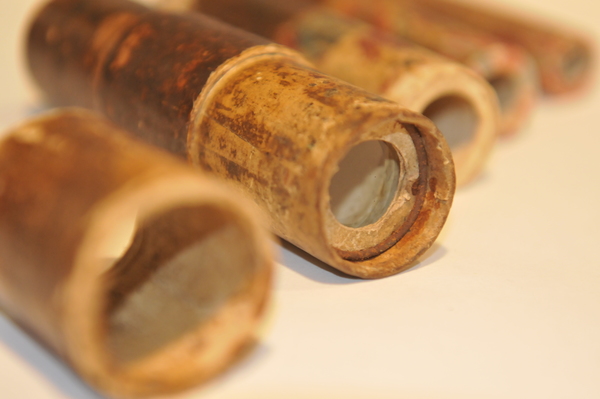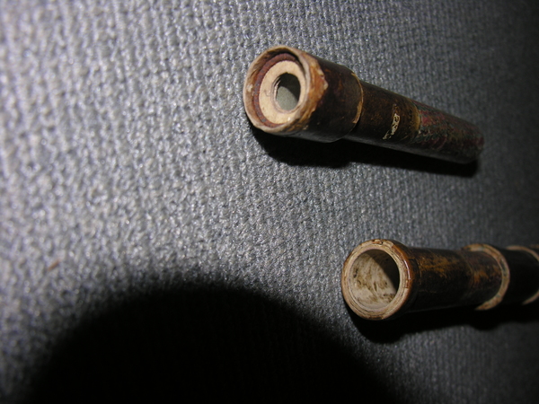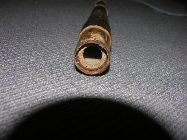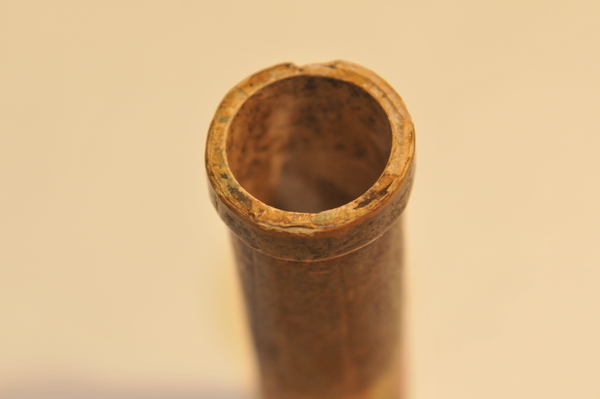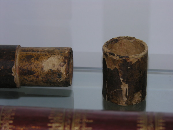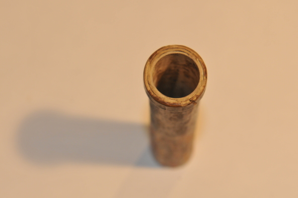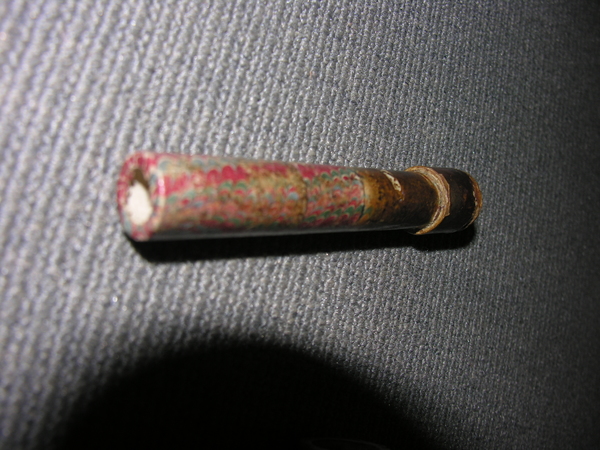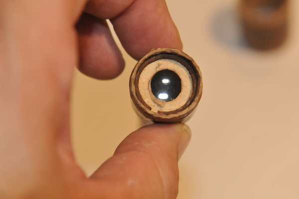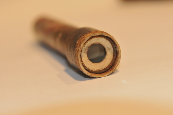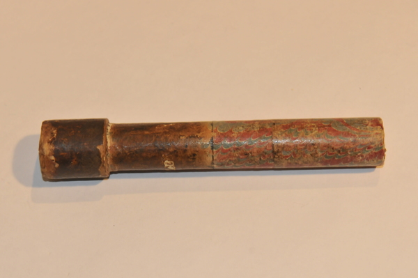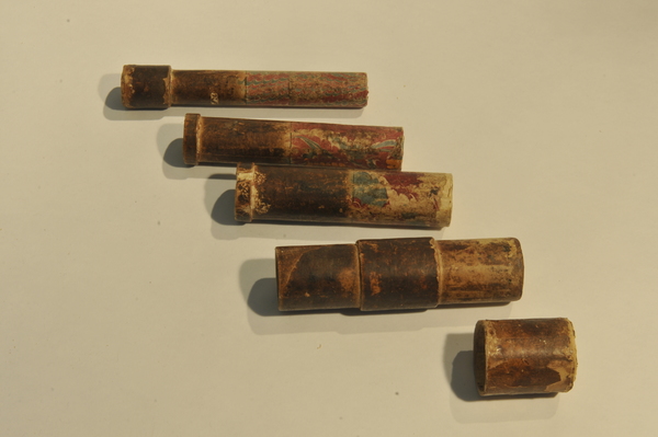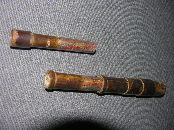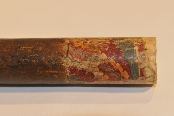 Brown Galilean. Possibly French. End rings get smaller. Wider waves on marbling, typical of 17 c. Sharp points but width is greater than mace ruette. Marbled paper is wrapped around stops. Draws are cardboard, and paper covers are folded over edges. Magnification 4-5x. Lens held in place by spring and paper gasket.