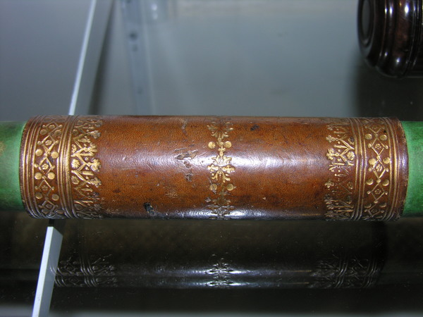 Materials: leather, paper, vellum, pasteboard, glass, boxwood, wood, gold tooling