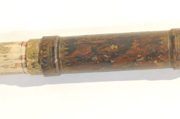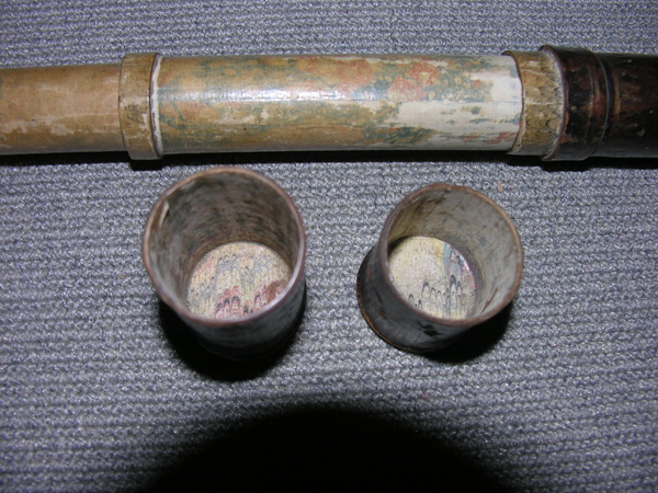 Four cardboard tubes covered in blue and pink marbled paper. When collapsed forms a cylinder enclosed by end caps. Objective of 23 mm stopped down to 19 mm. Very little information known about Dujardin (1594-1645). He was known for sundials. Negative eyepiece. Both lenses held in place with spring. Paper gasket to hold in place. End rings (ferrules) made of wood. Magnification 14x.