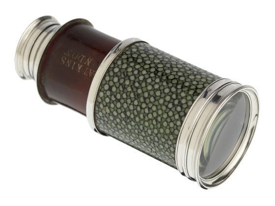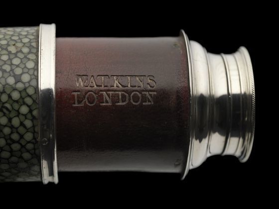 "This small Galilean telescope has a dyed rayskin barrel and a single draw tube of red leather. The other fittings are made of silver. The maker's name is stamped onto the draw tube as 'WATKINS LONDON'. Spy glass telescopes like this were made as personal accessories to fit in the pocket" (Royal Museum Greenwich).