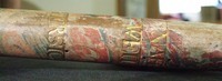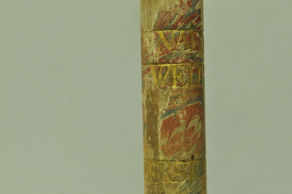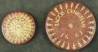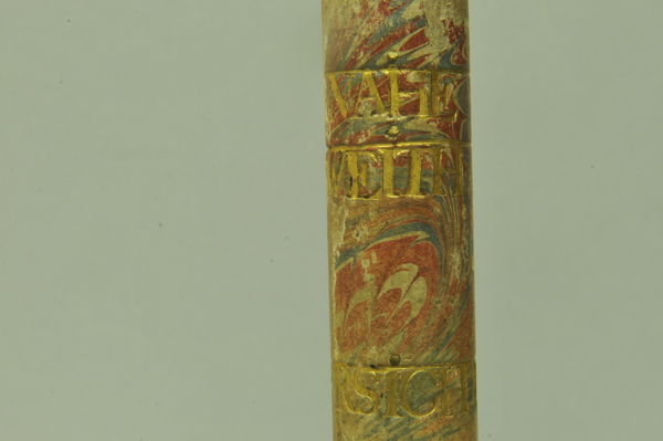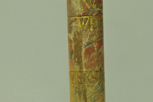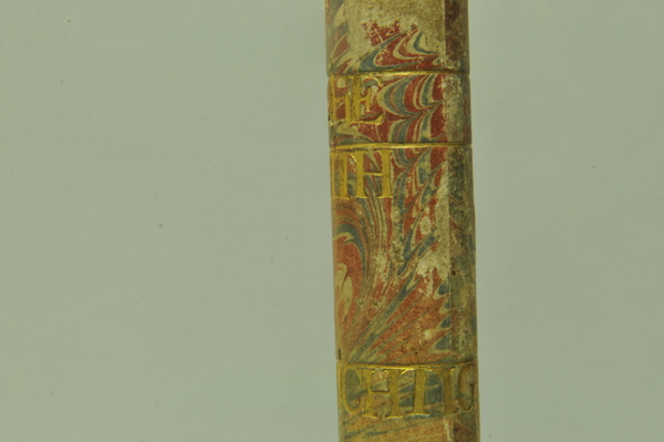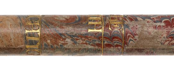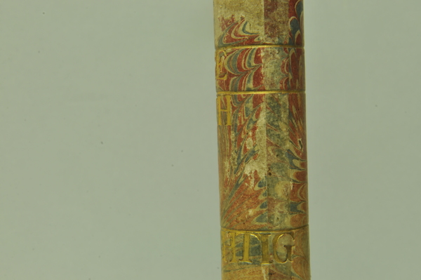 "This Galilean telescope has the name 'IACOB CUNIGHAM' and the date '1661' stamped onto the objective lens cap, making it one of the oldest dated telescopes in Britain. The two draw tubes are made of wood covered in marbled vellum, while the barrel and lens caps are made of wood covered in red leather with gold-tooled decoration. The eyepiece tube also has three gold-tooled stop lines identified by the German words 'NAHE', 'WEITH' and 'OVERSICHTIG'. These indicate different focusing lengths and suggest that the telescope was probably made in Germany. Jacob Cunigham may have been either the maker or the original owner of the telescope. The larger draw tube also has a single gold-tooled stop line. The curious shape of the barrel is designed to accommodate a large objective glass. At this time it was easier to grind a large lens than a small one. Brass diaphragms over the end of each lens have been used to reduce their apertures" (Royal Museums Greenwich).